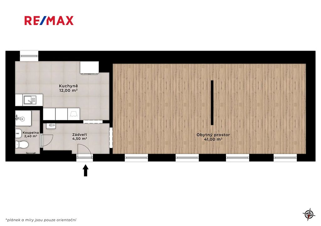 Současná dispozice nabízí vstupní předsíň, prostorný obývací pokoj oddělený částečnou příčkou od ložnice, samostatnou kuchyni se spotřebiči a koupelnu se sprchovým koutem a WC.