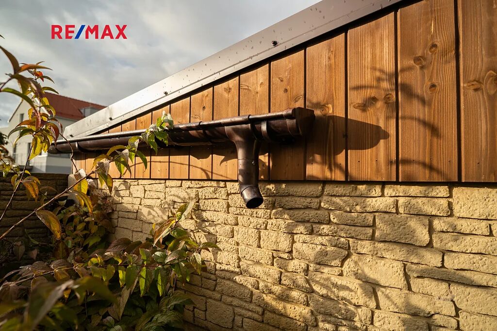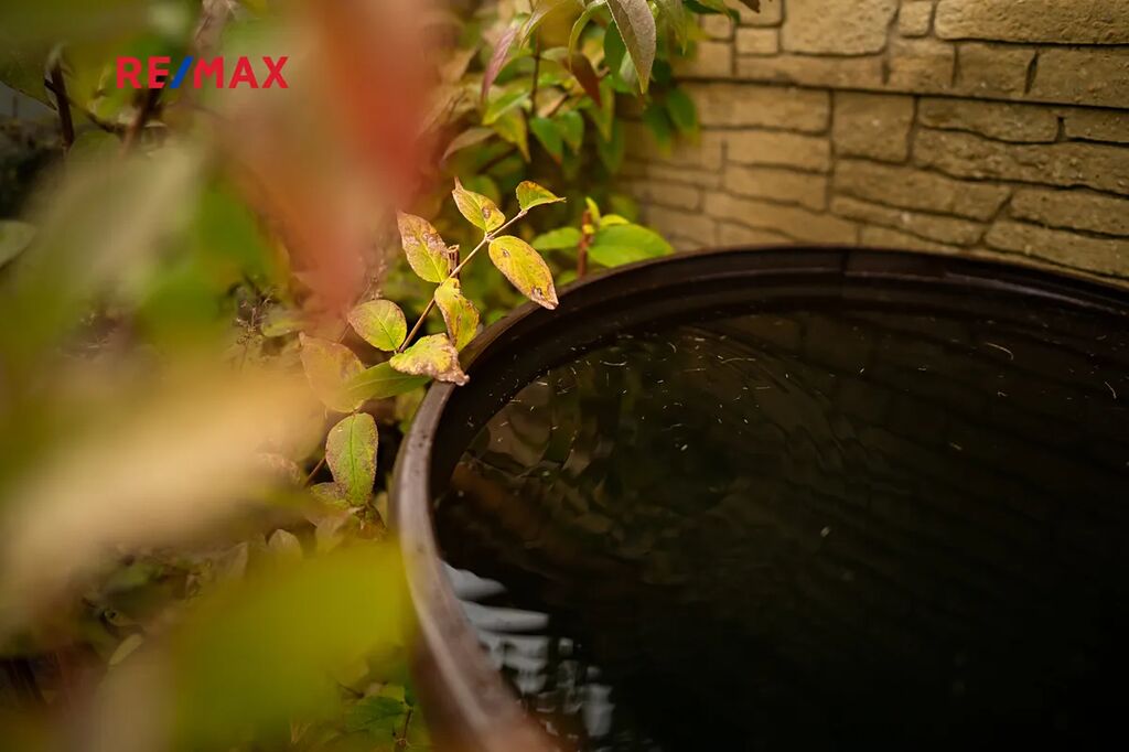 Dešťová voda je chytře využívána díky retenční nádrži s čerpadlem, kterou lze používat pro závlahu zahrady. Dům je tak nejen komfortní, ale i ekonomický a šetrný k životnímu prostředí.