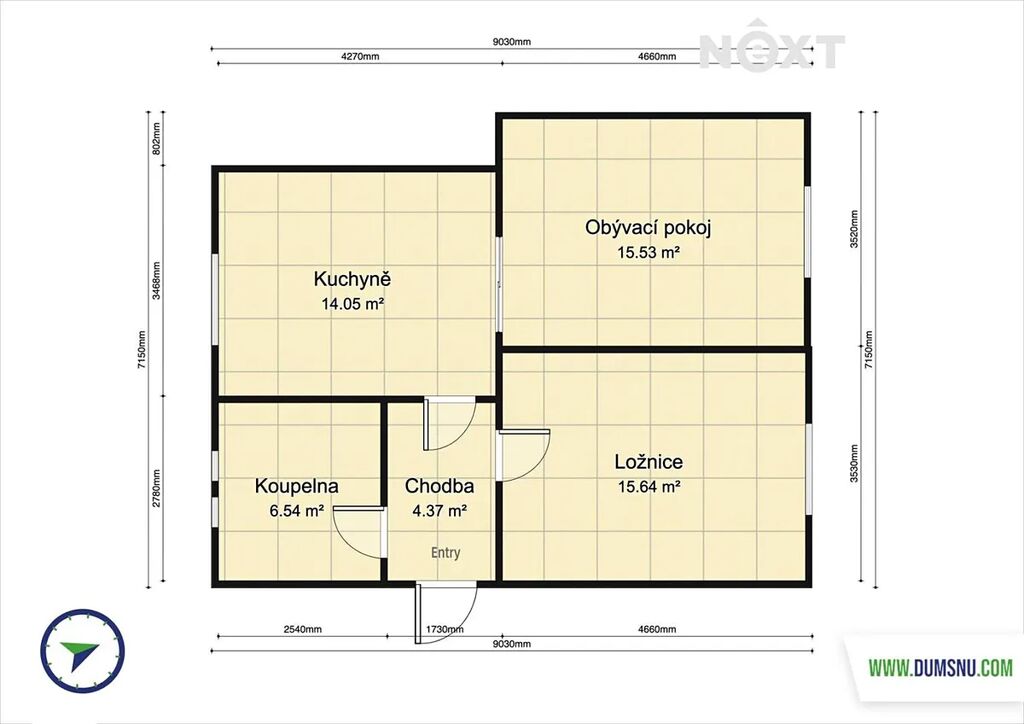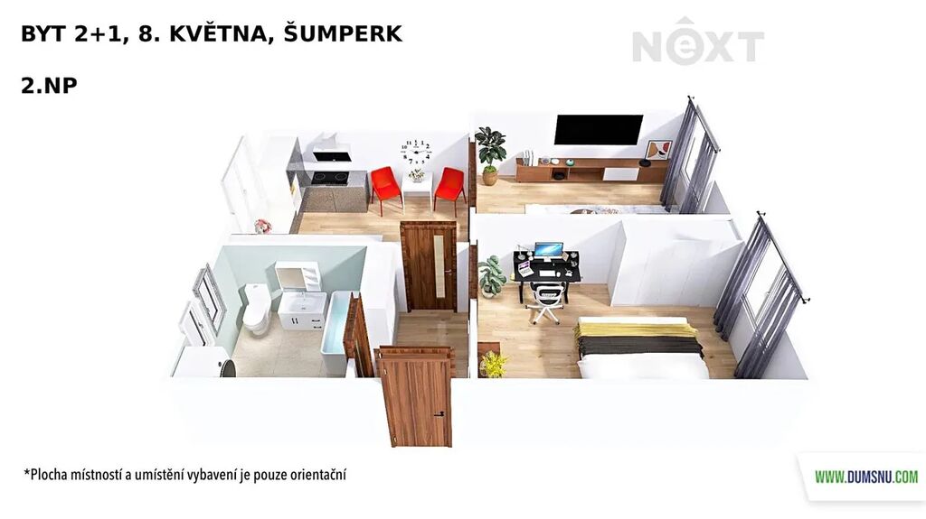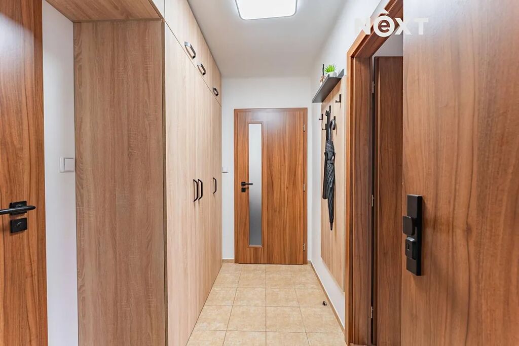 Dispozice bytu je praktická a promyšlená. Z prostorné chodby, ve které se nacházejí vestavěné skříně poskytující dostatek úložného prostoru, se vstupuje do ložnice a kuchyně. Z kuchyně je následně vstup do obývacího pokoje, který nabízí příjemné místo pro odpočinek. Kuchyň je vybavena moderní kuchyňskou linkou a spotřebiči, ložnice je dostatečně prostorná pro manželskou postel i další nábytek.