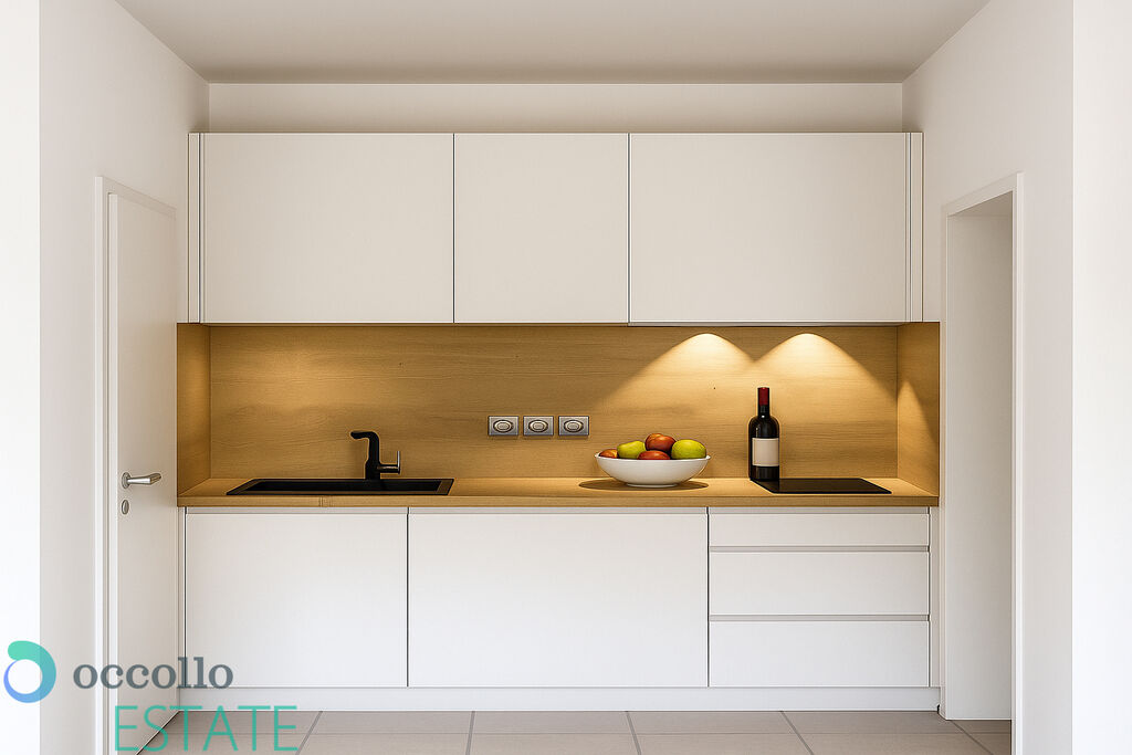 V bytě je nová kuchyňská linka vybavená vestavěnými spotřebiči – elektrická trouba, elektrická varná deska, digestoř a lednice.