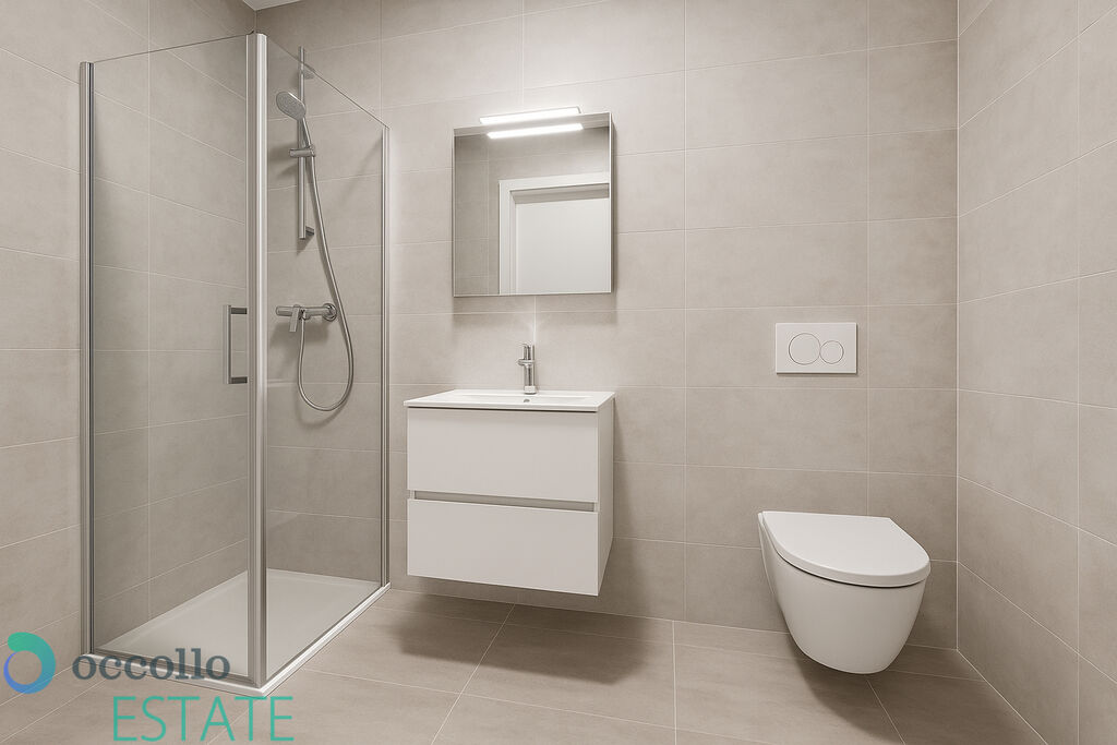 Koupelně dominuje sprchový kout, umyvadlo se skříňkou a zrcadlo s osvětlením.