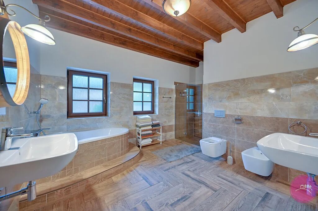 Ve výhradním zastoupení majitele nabízíme k prodeji zcela ojedinělou, nadstandartní nemovitost v obci Oskava, okr. Šumperk, uprostřed obcí Rýmařov, Šumperk a Uničov, do Olomouce 43 km, doba jízdy cca 45 minut autem. Nemovitost se nachází na samotě, na okraji obce, s cca 6000 m2 vlastního pozemku, obklopená lesy. Původní stavba pochází z roku 1923 - 1925, kdy kompletní rekonstrukce, přístavby a dostavba vrchního patra proběhla v letech 2013 - 2015. Při výběru nových materiálů byl kladen důraz především na kvalitu a dokonalost provedení. Inženýrské sítě jsou zavedeny všechny, plyn, elektřina, kanalizace a obecní voda, na pozemku také vlastní studna. Topení v celém domě podlahové, napojené na centrální topný systém - plynové, dále teplovodní vložka do obou krbů, ovládané termostaty a to v každé místnosti, centrální rozvod do topných těles. Dům je napojený na centrální zabezpečovací systém Jablotron, dále kamerový systém HIK CONENCT, internetové připojení řešeno vzduchem. Dům i střecha jsou zateplené. Střešní krytina umělý šindel - došky. Okna plastová s trojsklem. Podlahy dlažba, vrchní patro podlaha dubová, dub - interiérové dveře i obložky. Všechny kovové prvky originální kovářská práce. Nemovitost je částečně podsklepená, ve sklepě umístěn systém na vytápění a úprava na posezení. Nízké měsíční náklady - elektřina, plyn.