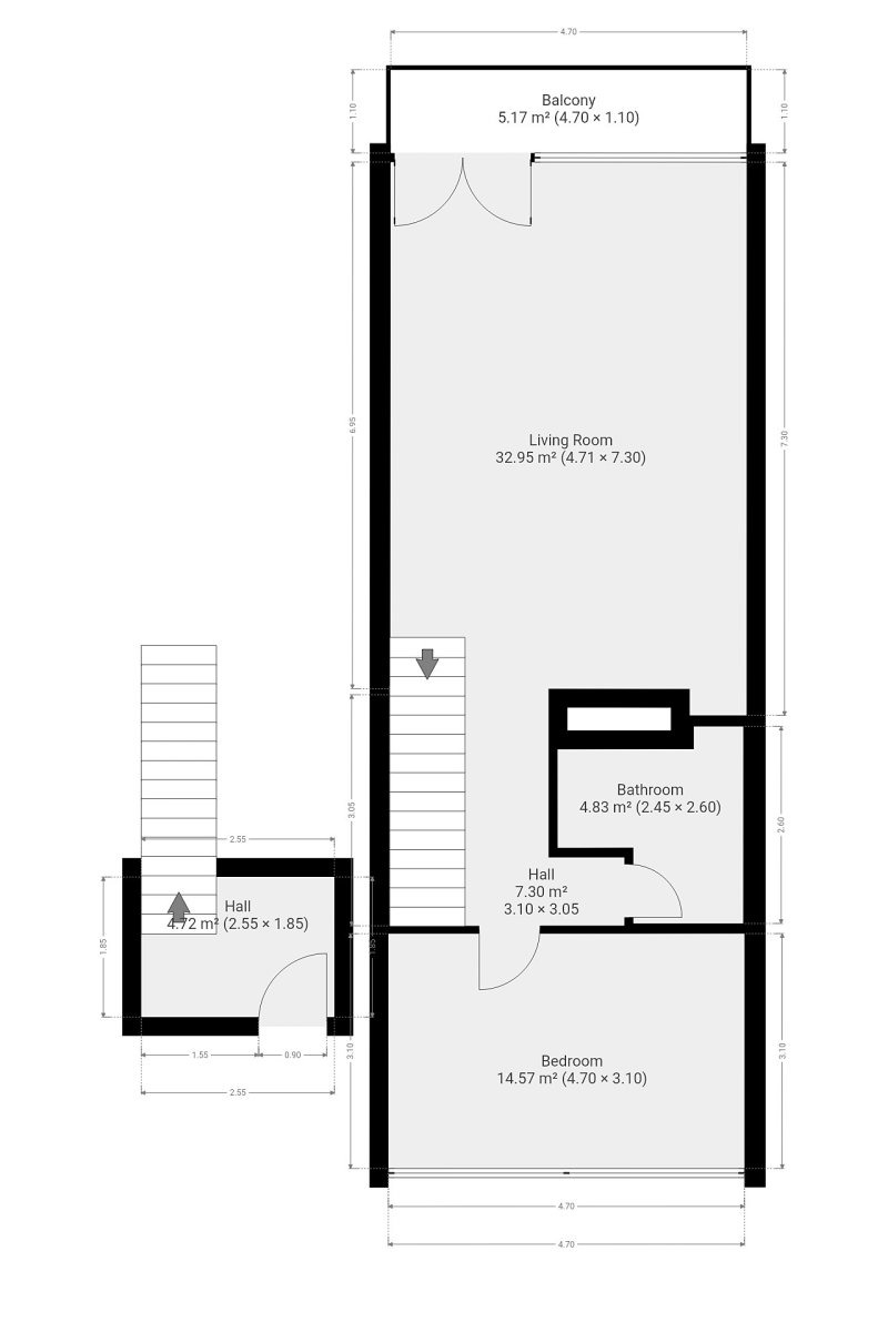 Vstup do bytu se nachází v pátém patře, po schodech nahoru se pak dostanete do obývacího pokoje s prakticky zařízeným kuchyňským koutem s dřezem, varnou deskou, myčkou, lednicí s mrazákem, troubou, digestoří a dostatkem úložného prostoru. Z obývacího pokoje je vstup přímo na balkon. Ložnice je neprůchozí. Koupelna je spojená s WC a je zde vana. Okna bytu jsou orientovaná na dvě světové strany, z oken obou pokojů je jedinečný výhled.