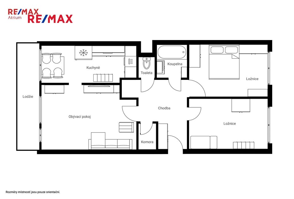 Byt je velmi dobře dispozičně řešen – prostorná vstupní předsíň propojuje všechny místnosti. K dispozici je samostatná kuchyň, obývací pokoj se vstupem na prostornou lodžii o velikosti 6 m², dvě neprůchozí ložnice, koupelna a samostatné WC. K bytu dále náleží sklepní kóje o velikosti 3,5 m² umístěná v suterénu domu.