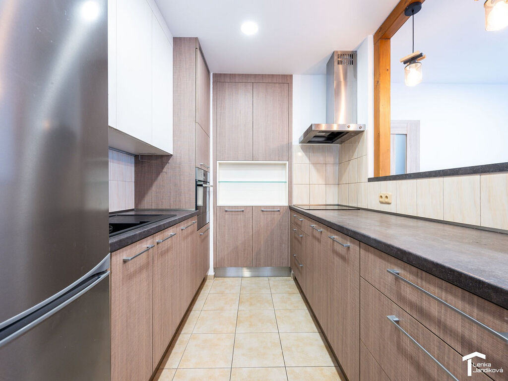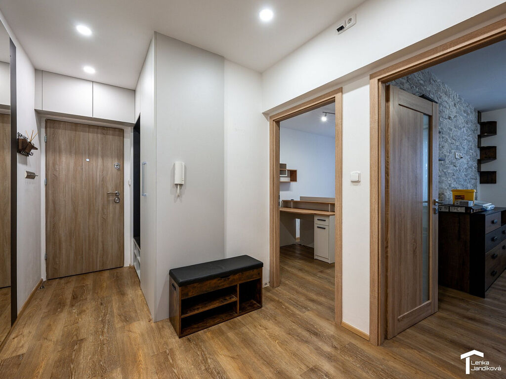 Po vstupu do bytu se ocitáme v chodbě, kde je umístěna vestavěná šatní skříň. Vpravo je vstup do obývacího pokoje, který je spojený s kuchyňským koutem a spíží. Na míru zhotovenou kuchyňskou linku s vestavěnými spotřebiči (elektrická trouba, myčka, varná deska, volně stojící lednice s mrazákem) a dostatečným úložným prostorem ocení především milovníci vaření. Obývací pokoj je částečně vybavený a vstoupíme z něj na zasklenou lodžií. Z chodby vlevo jsou dále dva samostatné pokoje. V ložnici je umístěná manželská postel bez matrace a roštů a dále vestavěná šatní skříň. V pokoji je k dispozici šatní skříň.