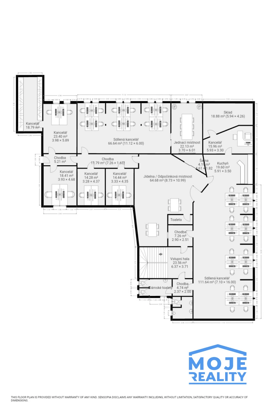 Prostory se nachází v nejvyšším patře budovy, jsou klimatizované a jsou členěny do několika samostatných kanceláří, dvou velkorysých sdílených open space prostorů, zasedací místnosti, kuchyňky, jídelny/odpočinkové zóny a skladu.
