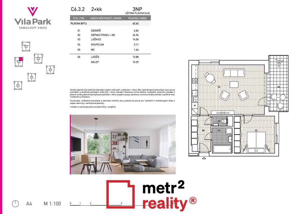 Nabízíme k prodeji moderní byt o dispozici 2+kk v žádané lokalitě, adresa Karla Mareše, Olomouc, který vznikl v rámci kvalitního developerského projektu společnosti GEMO = Vila Park Tabulový vrch. Projekt je vyhledáván pro svou nadčasovou architekturu, vysoký standard provedení a výjimečnou polohu v blízkosti běžeckých a cyklotras i přírody, a zároveň v bezprostřední blízkosti FN Olomouc, obchodních center, školních zařízení i sportovišť. Byt se nachází ve 3. nadzemním podlaží (s výtahem) a má celkovou užitnou plochu 62,63 m². K jednotce dále náleží prostorná lodžie o velikosti 10,88 m² s východní orientací, která nabízí příjemné posezení a dostatek soukromí, a dále zděný sklep 10,29 m² v suterénu domu.