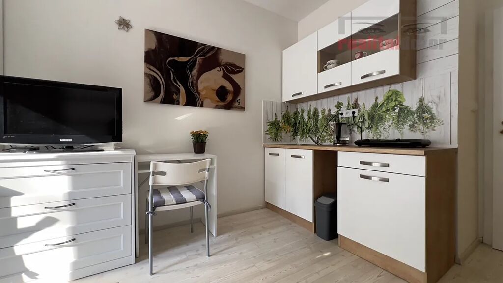 Dispozice: chodba 2,8 m2, pokoj s kuchyní 15,6 m2, koupelna se sprchovým koutem + WC 3,1 m2. Orientace bytu západ.