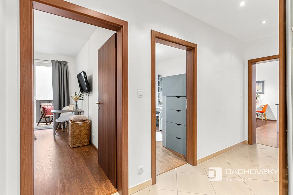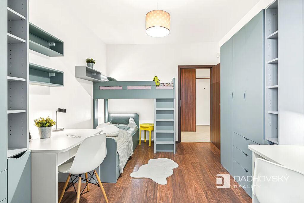 Dispozice bytu nabízí velmi příjemné a funkční rozložení: vstupní chodba, prostorný obývací pokoj s kuchyní o velikosti téměř 40 m², ložnice, dětský pokoj, koupelna a samostatná toaleta. Všechny pokoje jsou neprůchozí. Byt působí světlým, moderním a útulným dojmem. Součástí vybavení je kuchyně na míru a vestavěný nábytek, který může zůstat součástí ceny bytu (kromě dětského pokoje a několika drobností – upřesníme s konkrétním zájemcem). Byt disponuje zabezpečovacím systémem Jablotron s pohybovými čidly.
