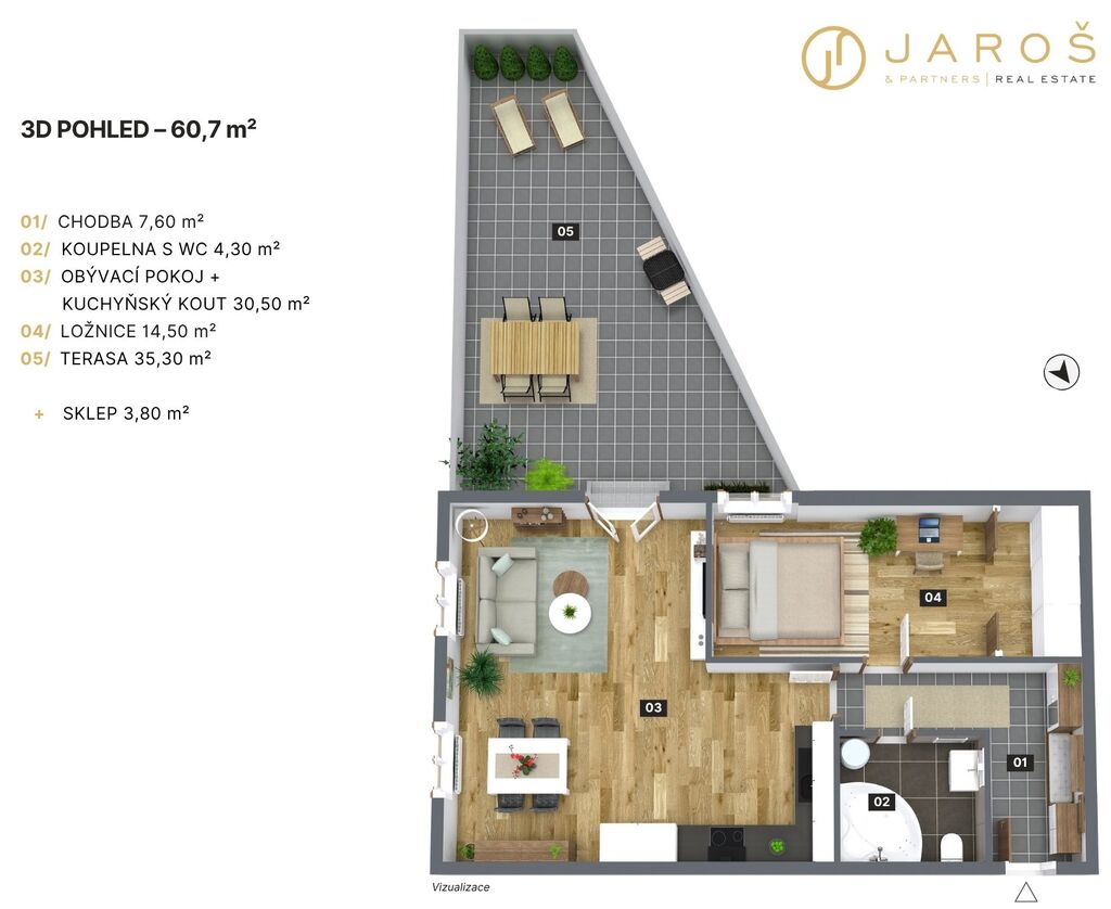 Dominantou bytu je terasa o ploše 35,3 m² s jihovýchodní orientací, ideální pro posezení, gril či vířivku. Vytápění zajišťuje vlastní elektrický kotel, ohřev vody bojler. K bytu náleží sklep (3,8 m²) a parkovací místo přímo u domu.