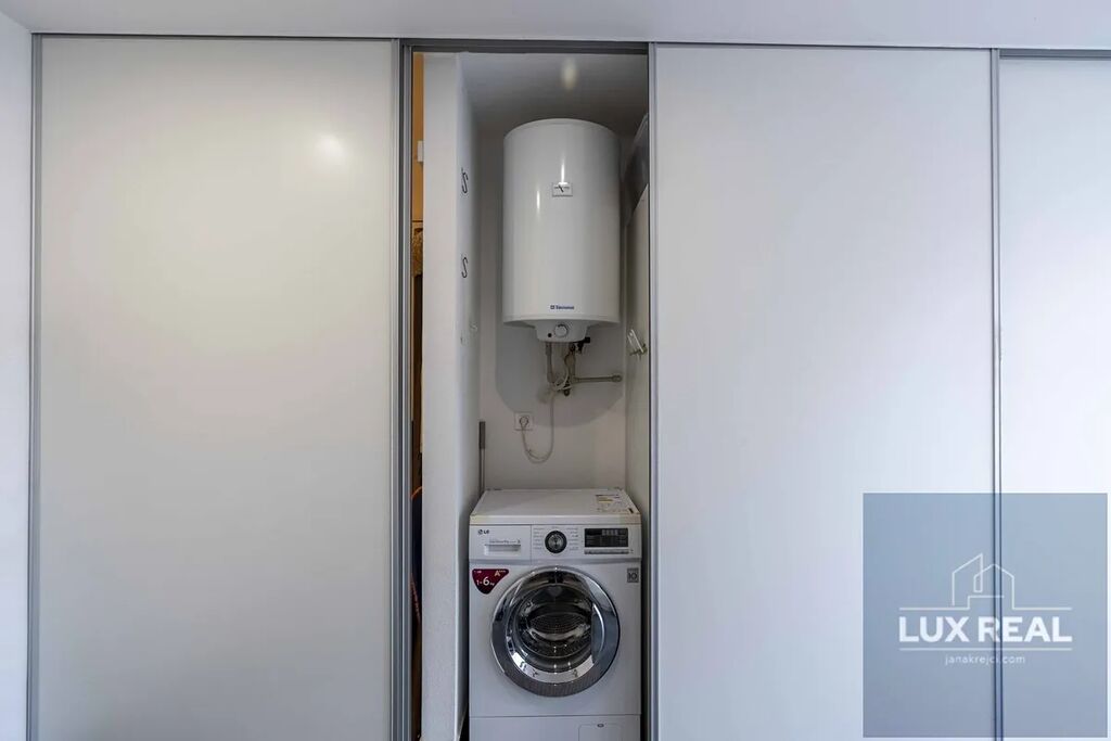 Vstupní chodba s vestavěnými skříněmi, které zároveň slouží i jako dveře oddělující chodbu od koupelny (sprchový kout, samostatně stojící vana, a oddělená toaleta), ale i od obytného otevřeného prostoru. Z této vstupní chodby se dostane také přímo na terasu.