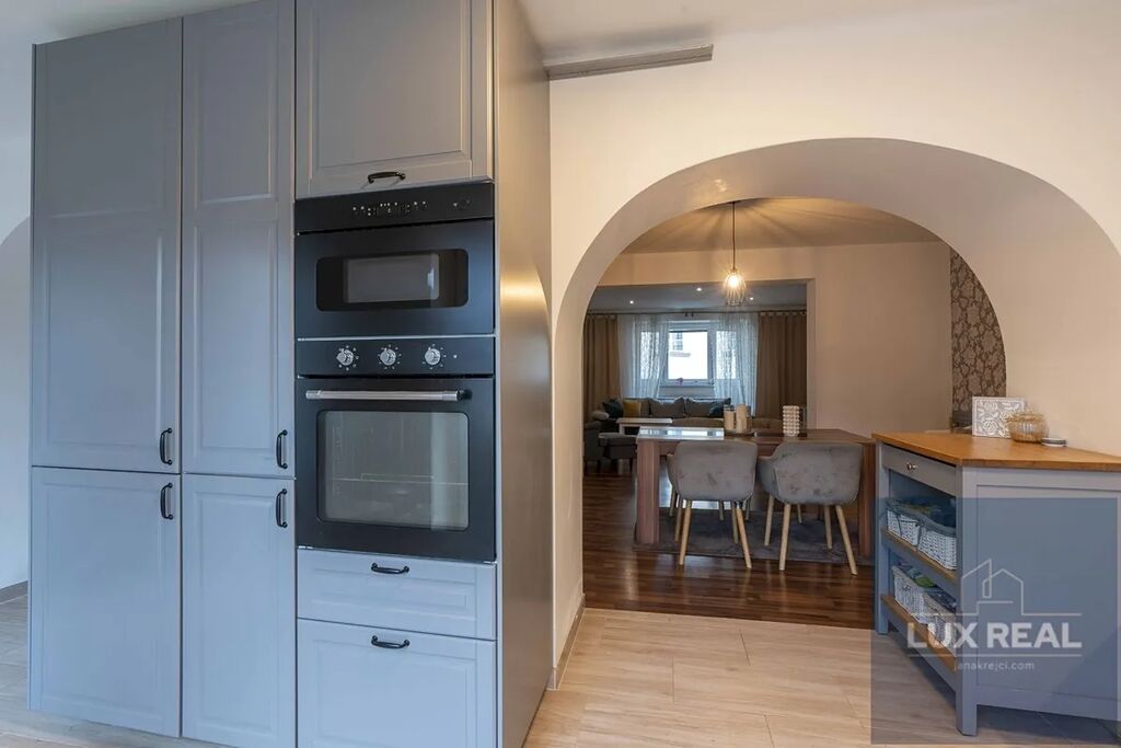 Kuchyně je komplet vybavena vestavěnými spotřebiči (myčka, mikrovlná trouba, elektrická trouba, lednice s mrazícím boxem).