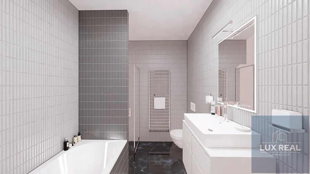 - sanitární technika, sprchový kout, včetně sprchového setu, umyvadlo včetně baterie, vana, závěsné WC, zrcadlo.