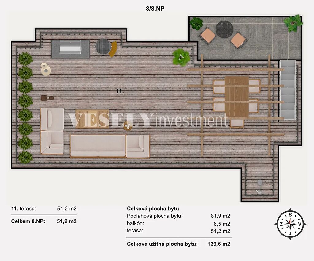 Obývací pokoj s KK je orientován na J do ulice, obě ložnice a balkón jsou orientovány na S do klidného vnitrobloku, šatna nebo pracovna se střešním oknem orientována jižně, střešní terasa na všechny světové strany.