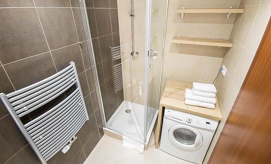 Součástí je prostorná koupelna se sprchovým koutem, pračkou, sušičkou a WC, dále vstupní chodba s dostatkem úložných prostor.