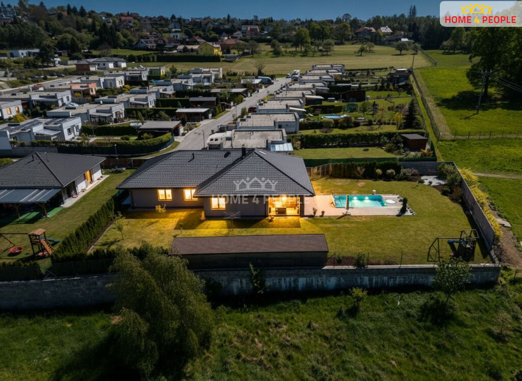 Ale skutečná magie začíná za prosklenými dveřmi. 1345 m² soukromého ráje s bazénem (20 m²), který promění každý letní den v dovolenou. Krytá terasa vám umožní užívat si venkovní prostor za každého počasí – od ranní kávy po večerní degustaci vína pod hvězdami.