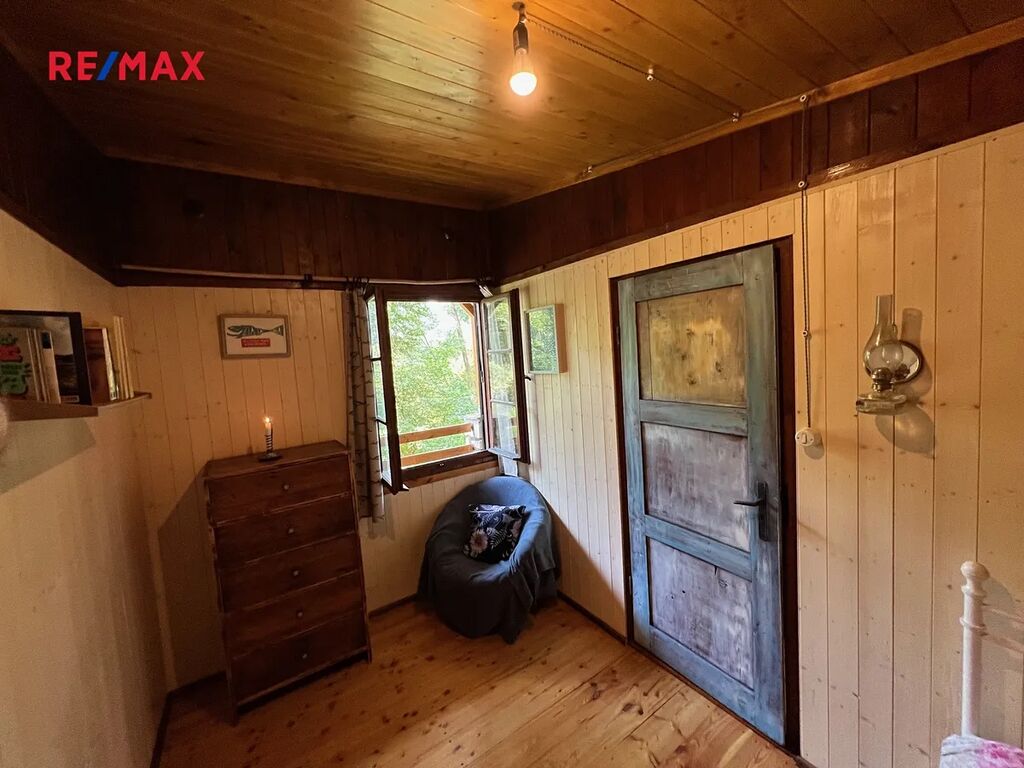 Romantický interiér nabízí obývací místnost s kuchyní a kuchyňskou linkou, stolem a židlemi, rozkládací gauč, krbová kamna. V pokoji se budete cítit jako u babičky, nebo jako na francouzském venkově... Manželská postel, obrázky, petrolejka, vůně přírody otevřeným oknem na terasu... Užitná plocha 25 m2, přivedena voda z IBC nádrže, na střeše solární panely s baterií a rozvodem po chatě na základní svícení a spotřebiče. U chaty je zbrusu nová latrína...