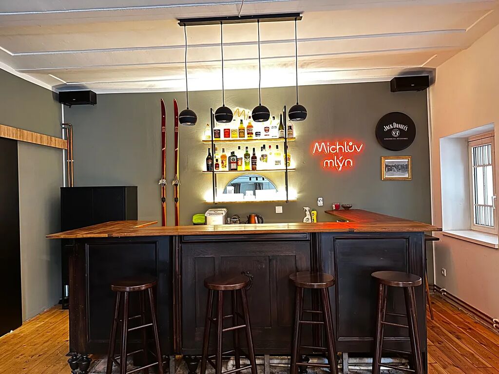 společenská místnost s barem, krbem a kulečníkem