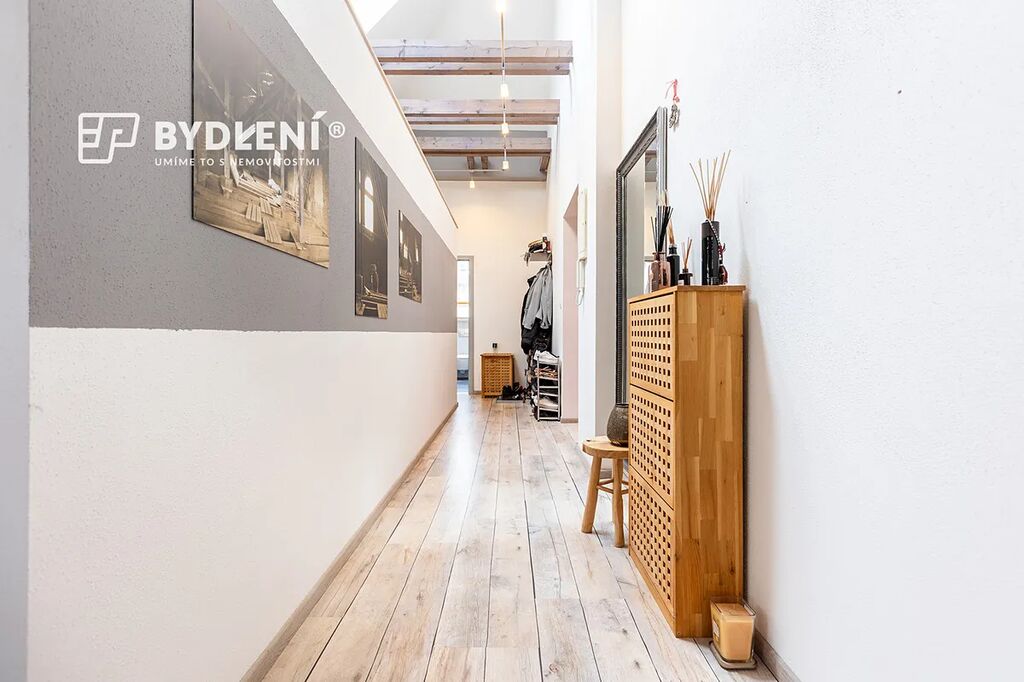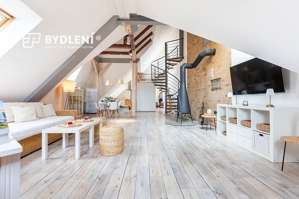 Interiér vás na první pohled zaujme otevřeným prostorem, vysokými stropy a dřevěnými prvky, které dodávají bytu jedinečný charakter. Dominantou obývací části je stylový krb, který vytváří příjemnou atmosféru a pocit domova i v chladnějších dnech.