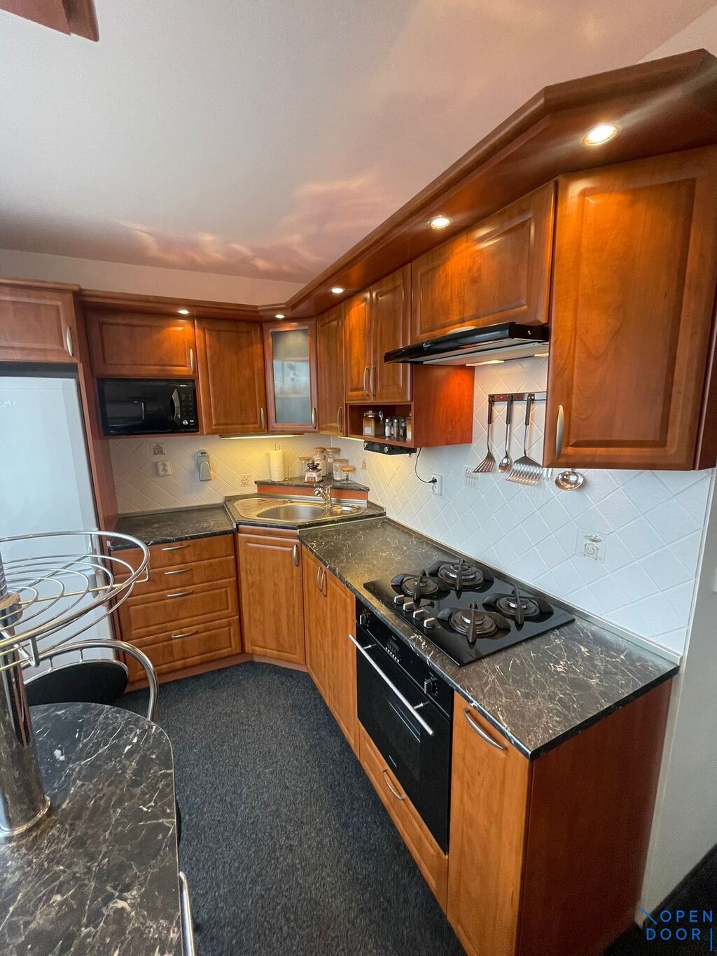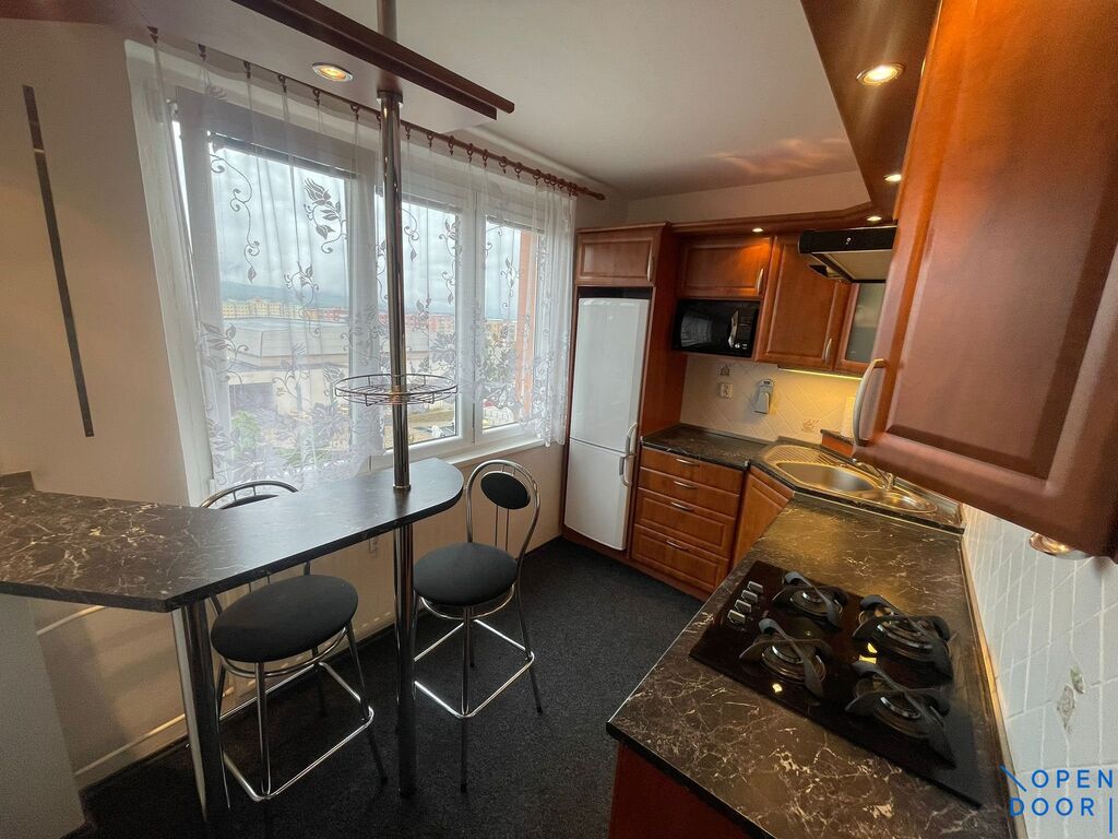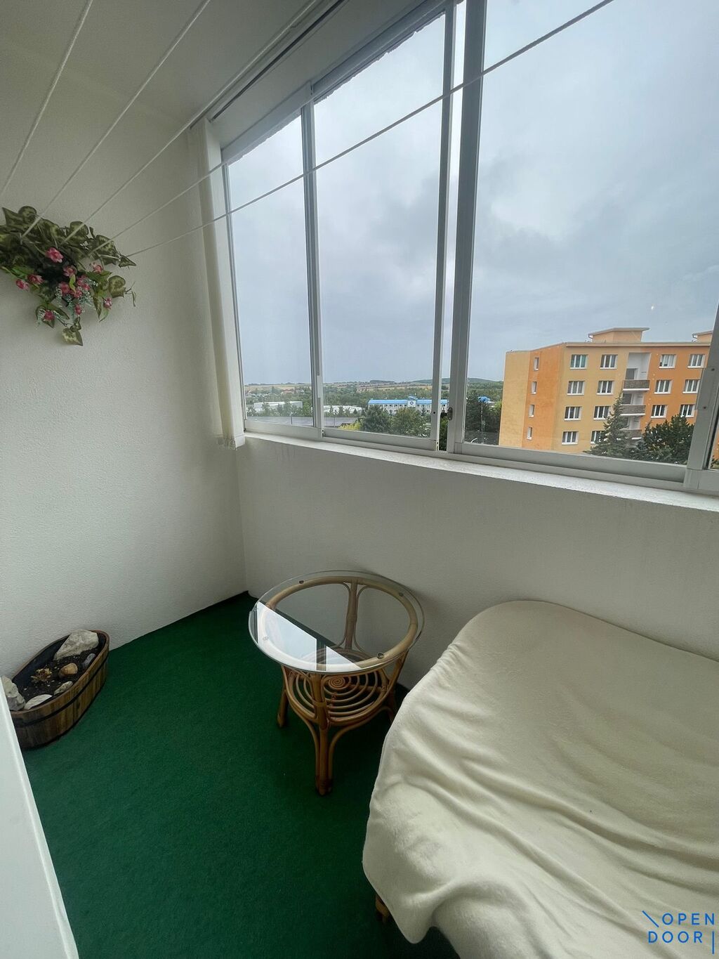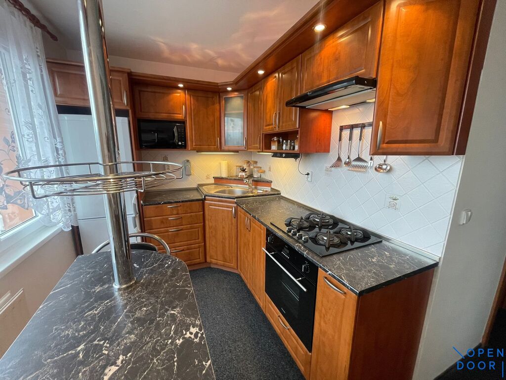 Byt se skládá ze vstupní chodby, obývacího pokoje s prostornou zasklenou lodžií, dvou samostatných pokojů a kuchyňské části s kuchyňskou linkou do tvaru „L“ vyrobenou na zakázku. Kuchyň je vybavena vestavnými spotřebiči – horkovzdušnou troubou a plynovou deskou BAUMATIC, výsuvnou digestoří WHIRLPOOL, mikrovlnnou troubou a lednicí.