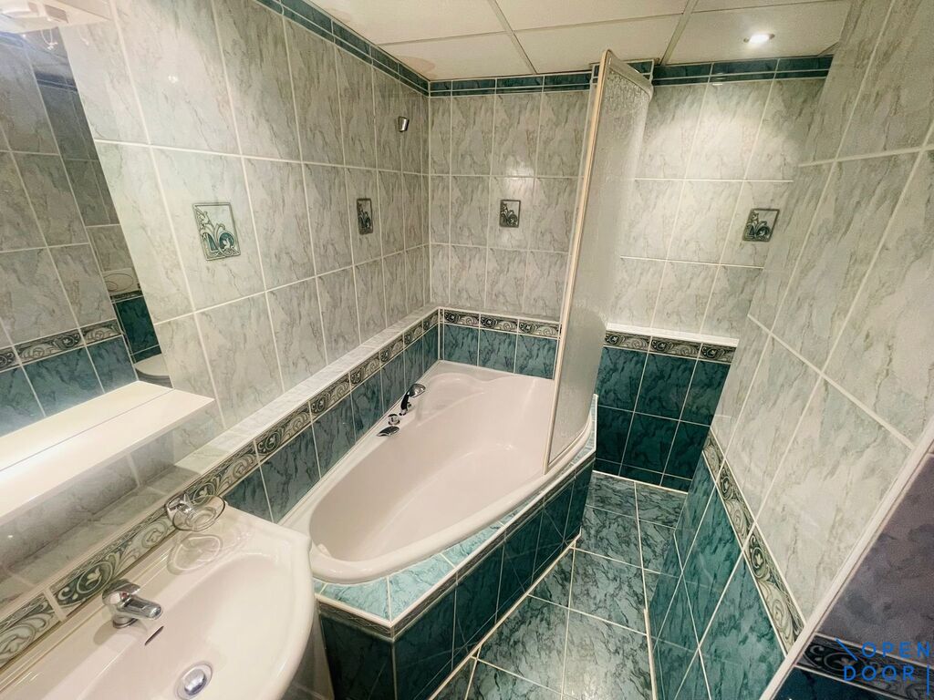 Koupelna je zděná a disponuje vanou se zástěnou, zrcadlem se skříňkou a pračkou, WC je samostatné. Posuvné dveře do koupelny jsou rovněž na míru.