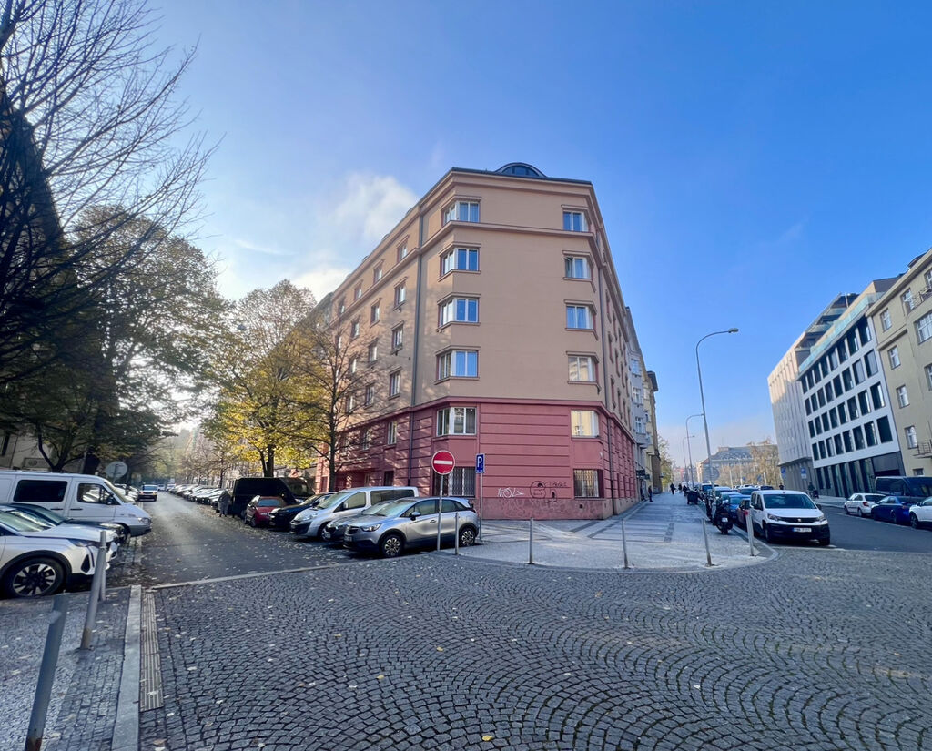 Dispozice: prostorná předsíň, koupelna, samostatné WC, komora, ložnice orientovaná do vnitrobloku a obývací pokoj s kuchyňským koutem s okny do ulice. Dům má udržované společné prostory a menší vnitřní dvůr, který je k dispozici pro obyvatele domu.