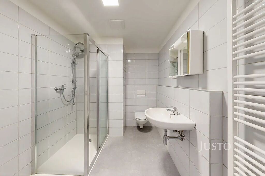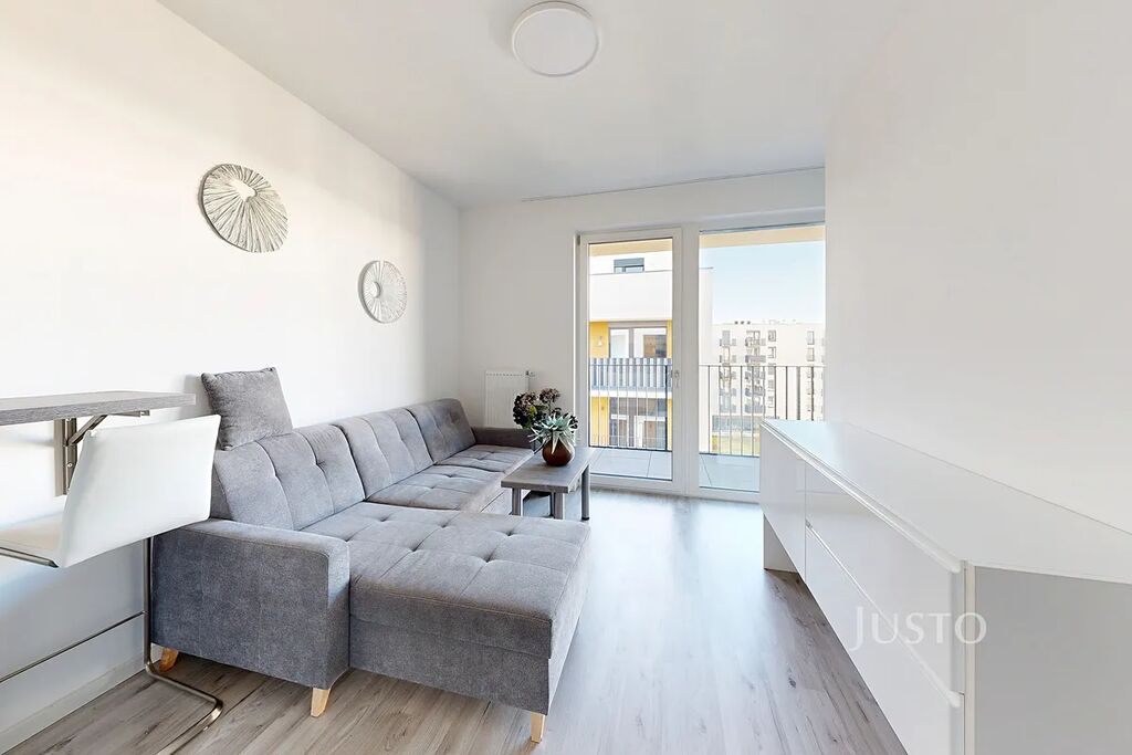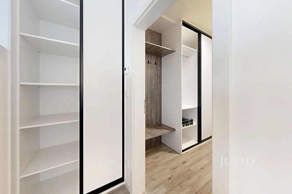 Interiér majitelé vybavili nábytkem na míru (vše, co vidíte na fotkách). Jedná se sice o byt s dispozicí 1+kk, ale v obýváku je vkusně vyřešený „spací kout“. Kuchyňská linka je kompletně zařízena – k dispozici je lednice, indukční varná deska, myčka, trouba, mrazák i barový jídelní stůl se dvěma židlemi. V koupelně najdete prostorný sprchový kout, toaletu a místo pro pračku.