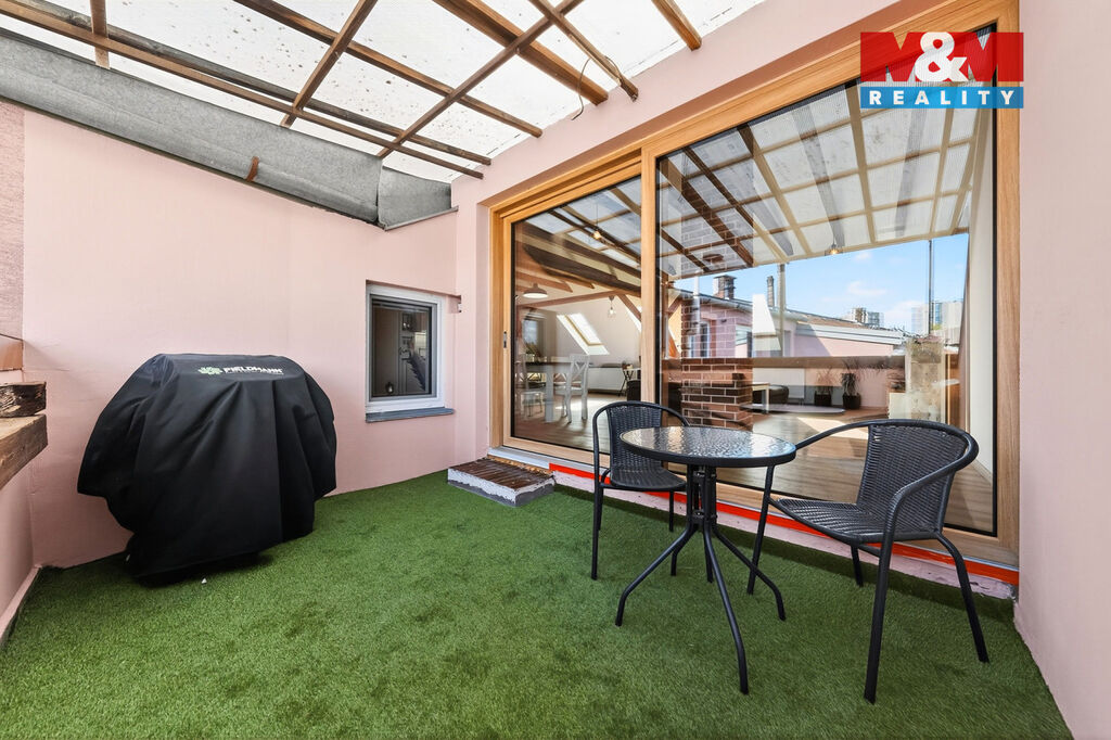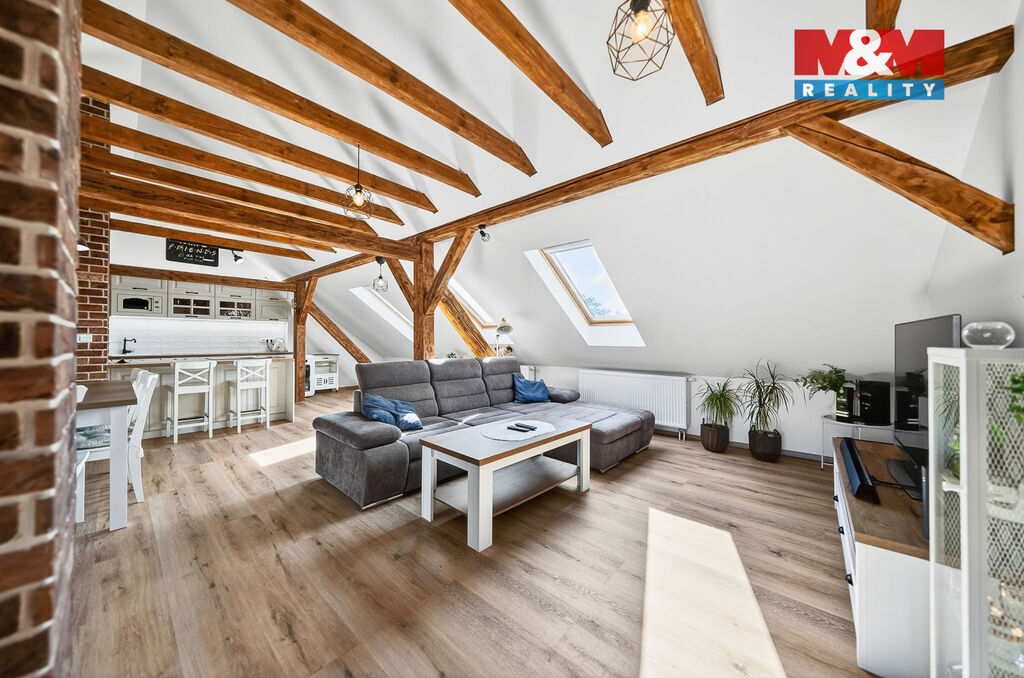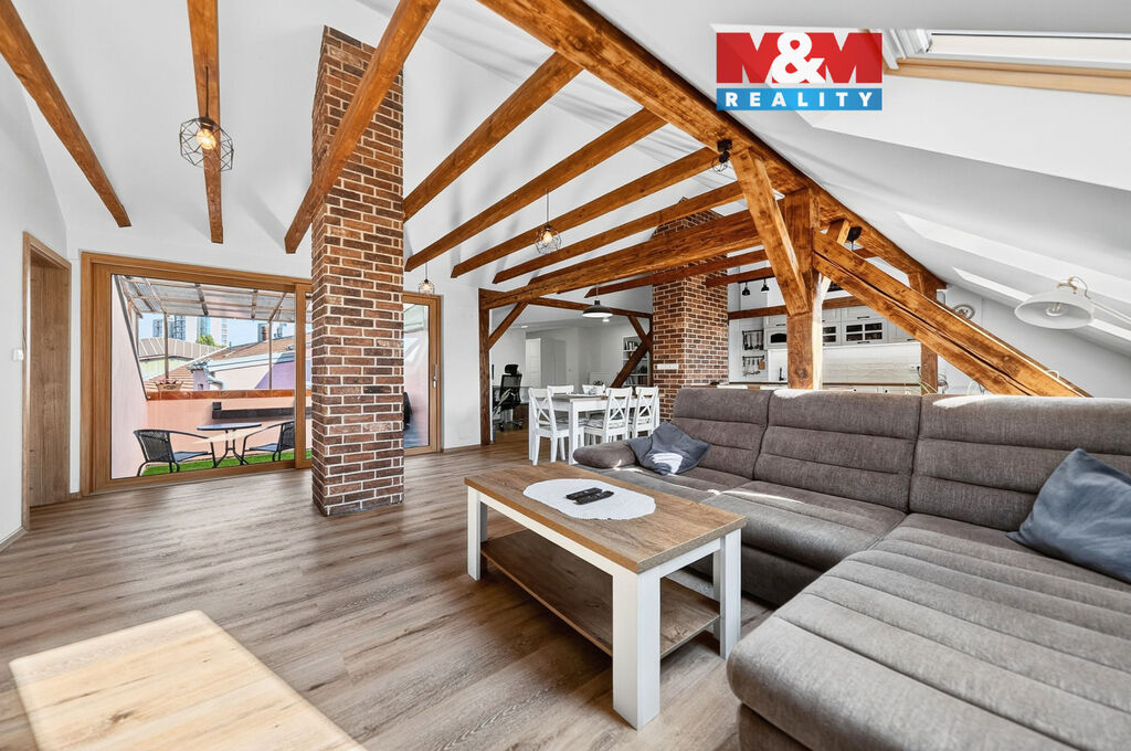 Byt o podlahové ploše 125 m² se nachází v podkroví ve 2. patře bytového domu. Dominantou je velkorysý obývací prostor s kuchyňským koutem - 60 m², otevřeným stropem a přiznanými trámy, které dodávají interiéru jedinečnou atmosféru. Z obývacího pokoje se vstupuje na terasu o velikosti 10 m² s výhledem do vnitrobloku.
