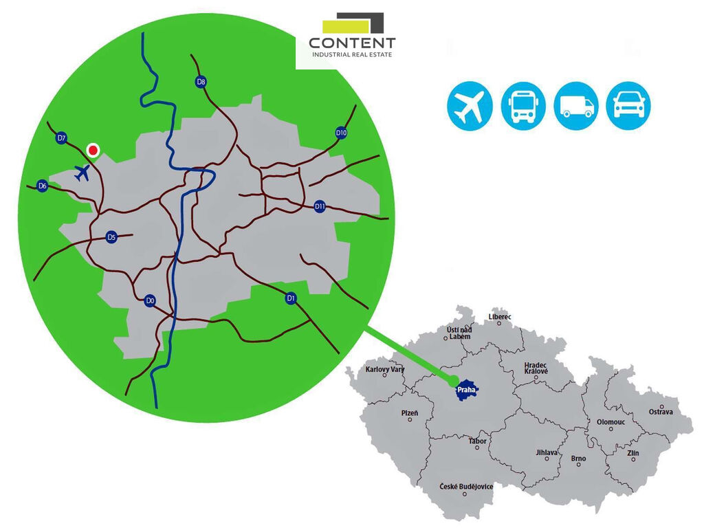 V zastoupení majitele a bez provize nabízíme industriální prostory, umístěné na strategickém místě nedaleko Letiště Václava Havla, s výbornou dostupností na dálnici D7 a do Prahy: