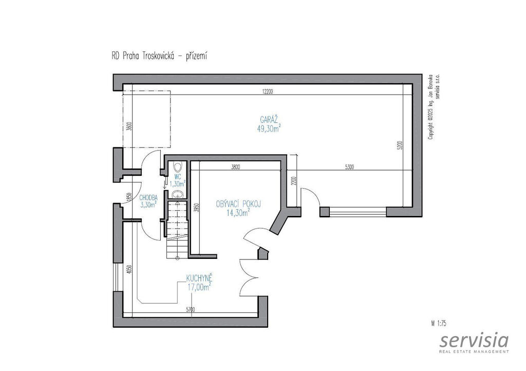 Na chodbě je pak WC místnost, ve které je umístěna i sprcha. Dominantou přízemí domu je prostorná garáž o výměře 50 m², kde z části tohoto prostoru je možné vybudovat další obytnou místnost.