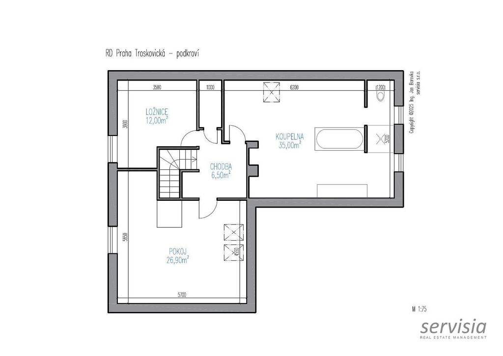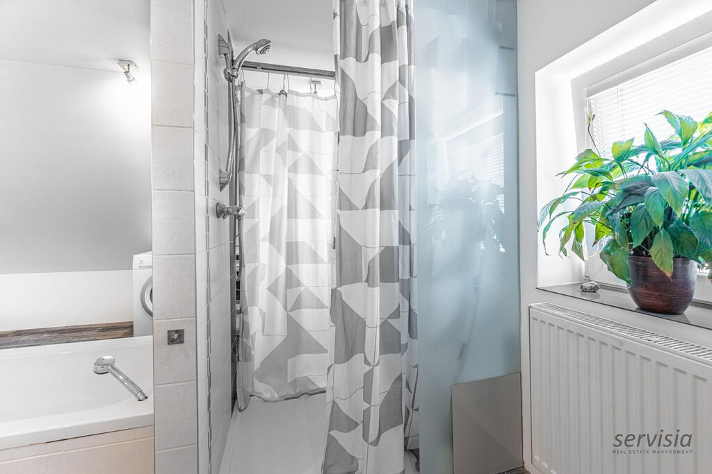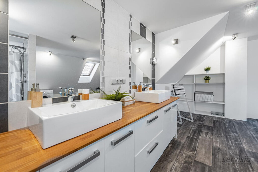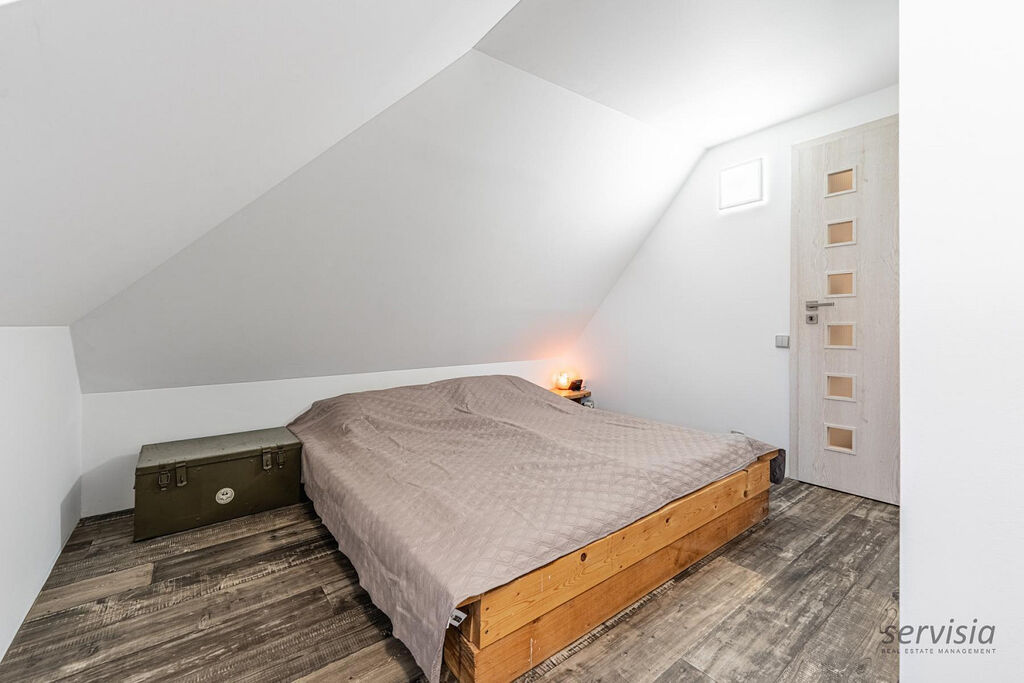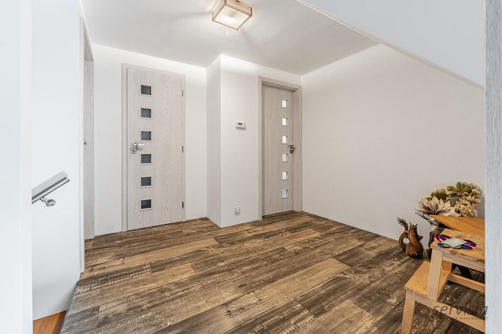 V horní části domu jsou umístěny 2 ložnice, šatna a prostorná koupelna o výměře 35 m², kde je umístěna vana i sprchový kout. Zároveň se zde nachází bojler a elektrokotel. Dům je vybaven centrálním vysavačem, který zajišťuje pohodlný a efektivní úklid.