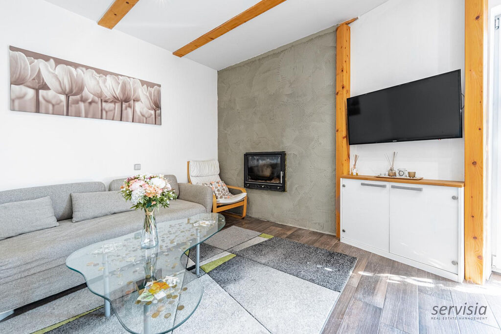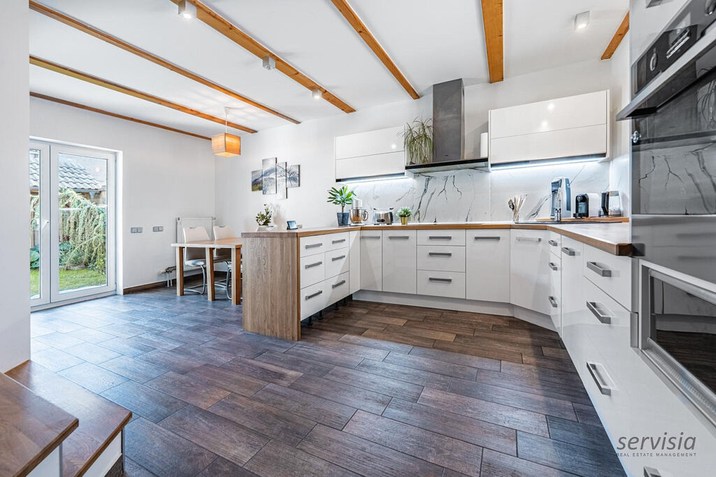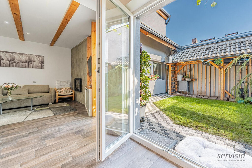 Při vstupu do domu je vpravo kuchyně spojená s obývacím pokojem, ze kterého je výstup na malou zahrádku o výměře cca 30 m², kde je možné nerušeně odpočívat.