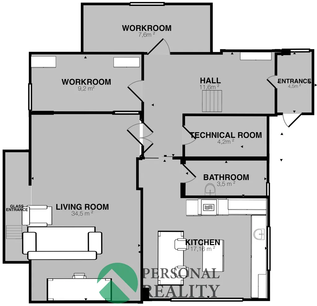 Suterén: hudební atelier/posilovna, wellness místnost se saunou, WC a sprchovým koutem, sklad a technická místnost (bojler a kotel).