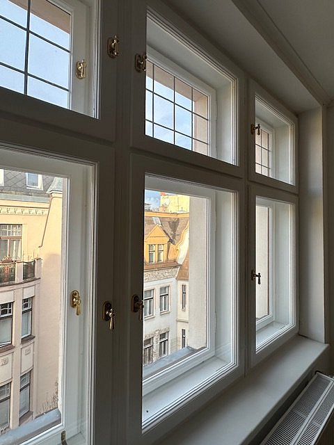 Dominantou bytu jsou veliké pokoje s okenními výklenky (28 m², 22 m², 16 m²), samostatná kuchyň (17 m²) a zcela jistě původní dvoukřídlé dřevěné dveře, historická krbová kamna a dřevěné parkety - dobrý stav, nová špaletová okna. Byt je vybaven vkusnou kuchyňskou linkou, vlastní plynový kotel, svítidla, neprůchozí pokoje - vše v nové čistě bílé výmalbě. Orientace bytu: jihozápad - jihovýchod, dům je bez výtahu / 66 schodů.