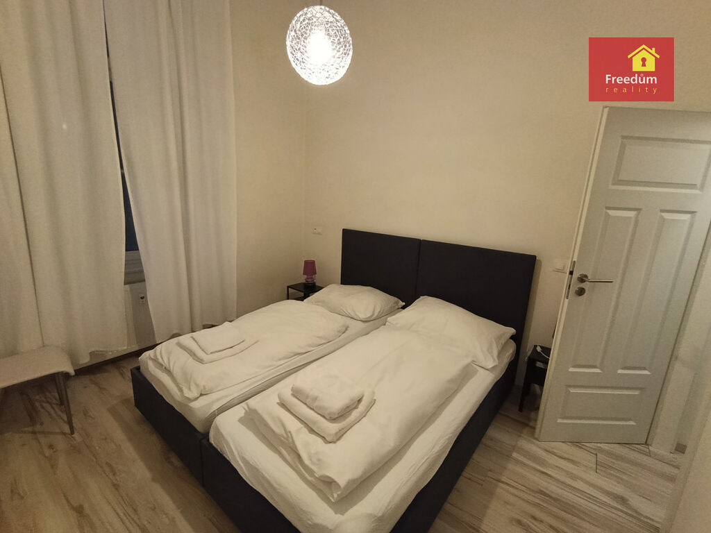 Prostorný vybavený byt v prvním podlaží vily, osobní vlastnictví. Obývací pokoj je spojen s kuchyn, ložnice a šatna, k dispozici je koupelna se sprchovým koutem a WC. Byt se prodává zařízený. K bytu náleží větší místnost ve sklepě o velikostí 26 m2.
