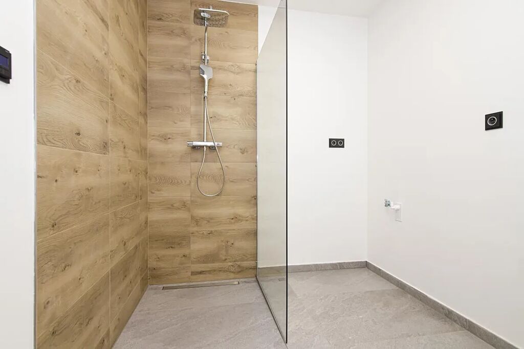 - dům nabízí dvě koupelny, v přízemí s walk-in sprchovým koutem a samostatným WC, v patře s volně stojící vanou, walk-in sprchovým koutem a WC