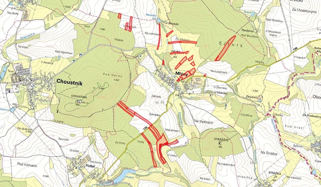 Předmětem prodeje je půda na parcelách 39/4, 39/5, 69, 283/2, 284, 285, 290, 365/8, 367, 368, 382/3, 382/7, 382/10, 382/13, 384, 386, 413, 781/3, 792, 803, 820/4, 867, 896/6, 896/9, 896/13, 915, 921, 923, 933/4, 953, 954, 961, 980/1, 980/4, 1007/16, 1007/17, 1007/18, 1007/41, 1095/7, 1136, 1139, 1143 a 1155 zapsaných na LV 169 v KÚ Mlýny u Choustníku.