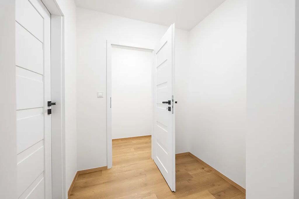 Byt vypadá přesně jak vidíte na fotografiích, nejedná se o vizualizaci. Kuchyně je vyrobena na míru a kompletně vybavená spotřebiči (elektrická trouba, mikrovlnná trouba, indukční deska, myčka) a spolu s obývacím pokojem vytváří ideální společenský prostor. Prostorná koupelna je s vanou, sprchovou zástěnou a umyvadlovou skříňkou se dvěma zásuvkami. V bytě je také prostorná komora nebo šatna.