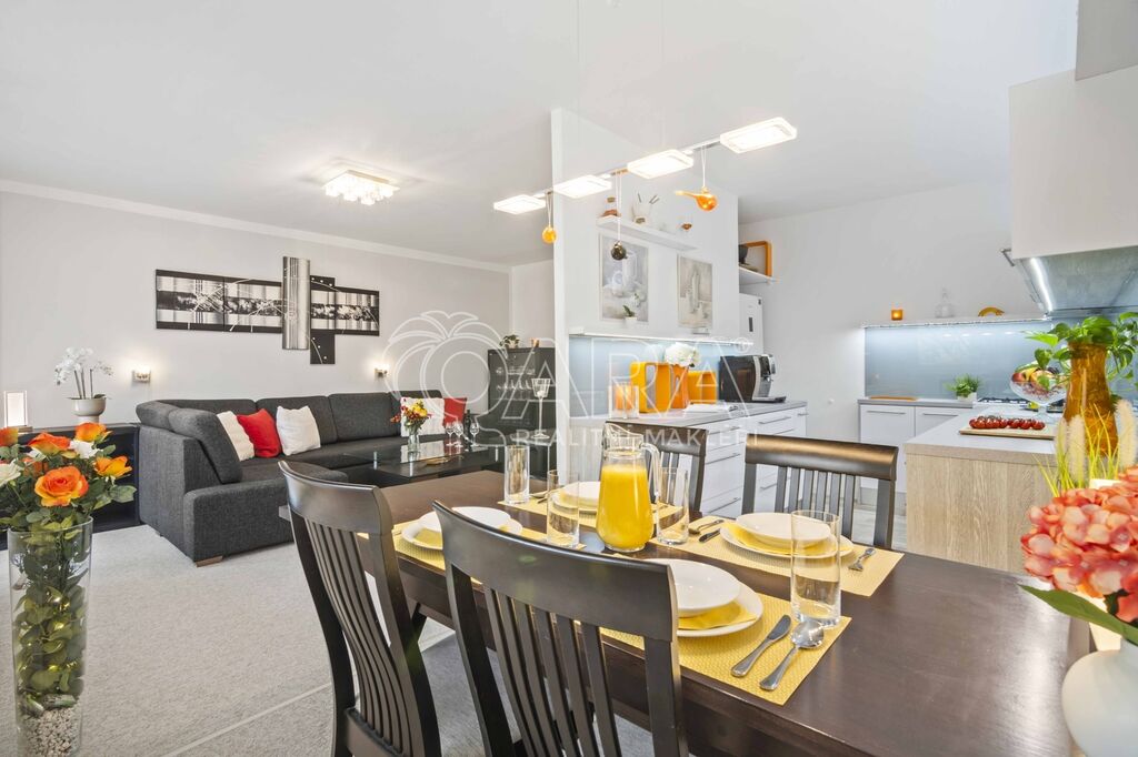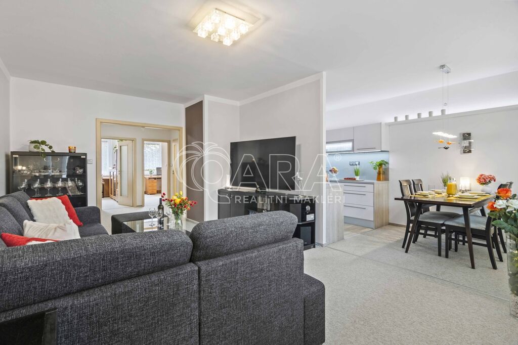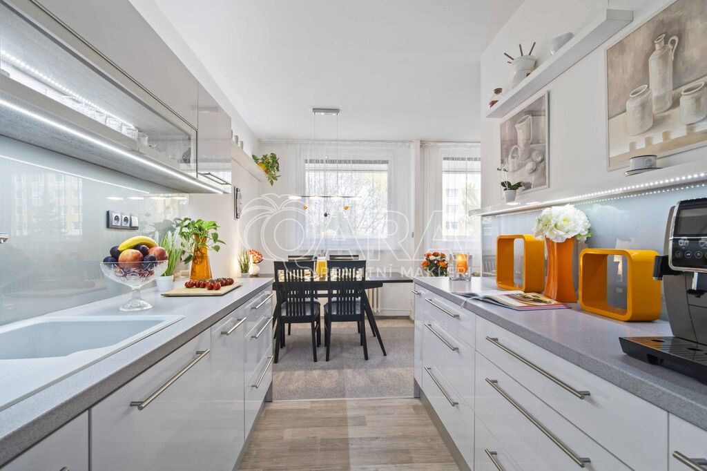 Diamantem bytu je obývací pokoj zalitý odpoledním sluncem a moderní kuchyňský kout.
