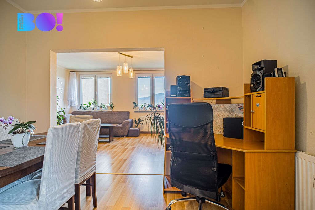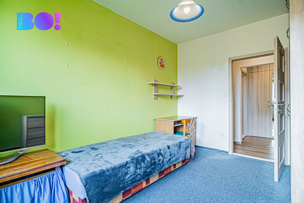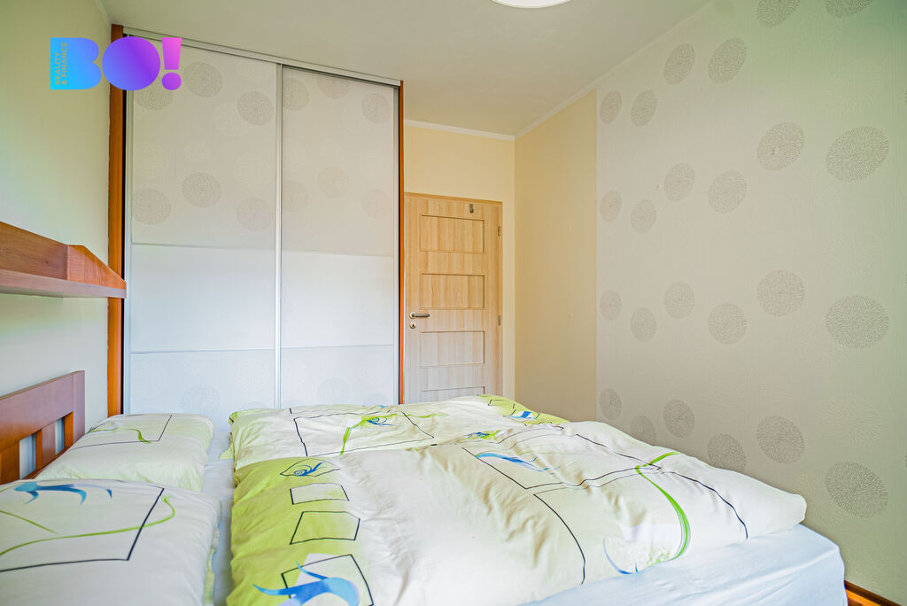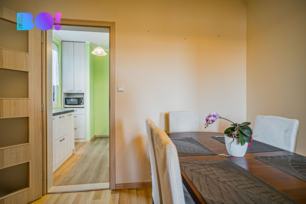 Dostatek úložného prostoru spolu s jídelním koutem dělá z bytu ideální domov pro rodinu, která hledá funkční a útulné zázemí.
