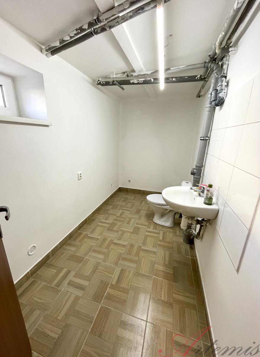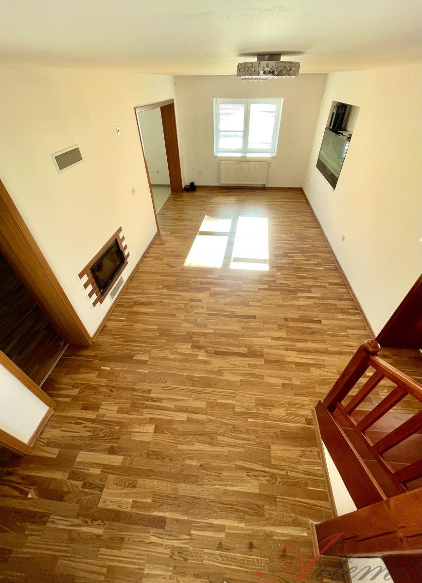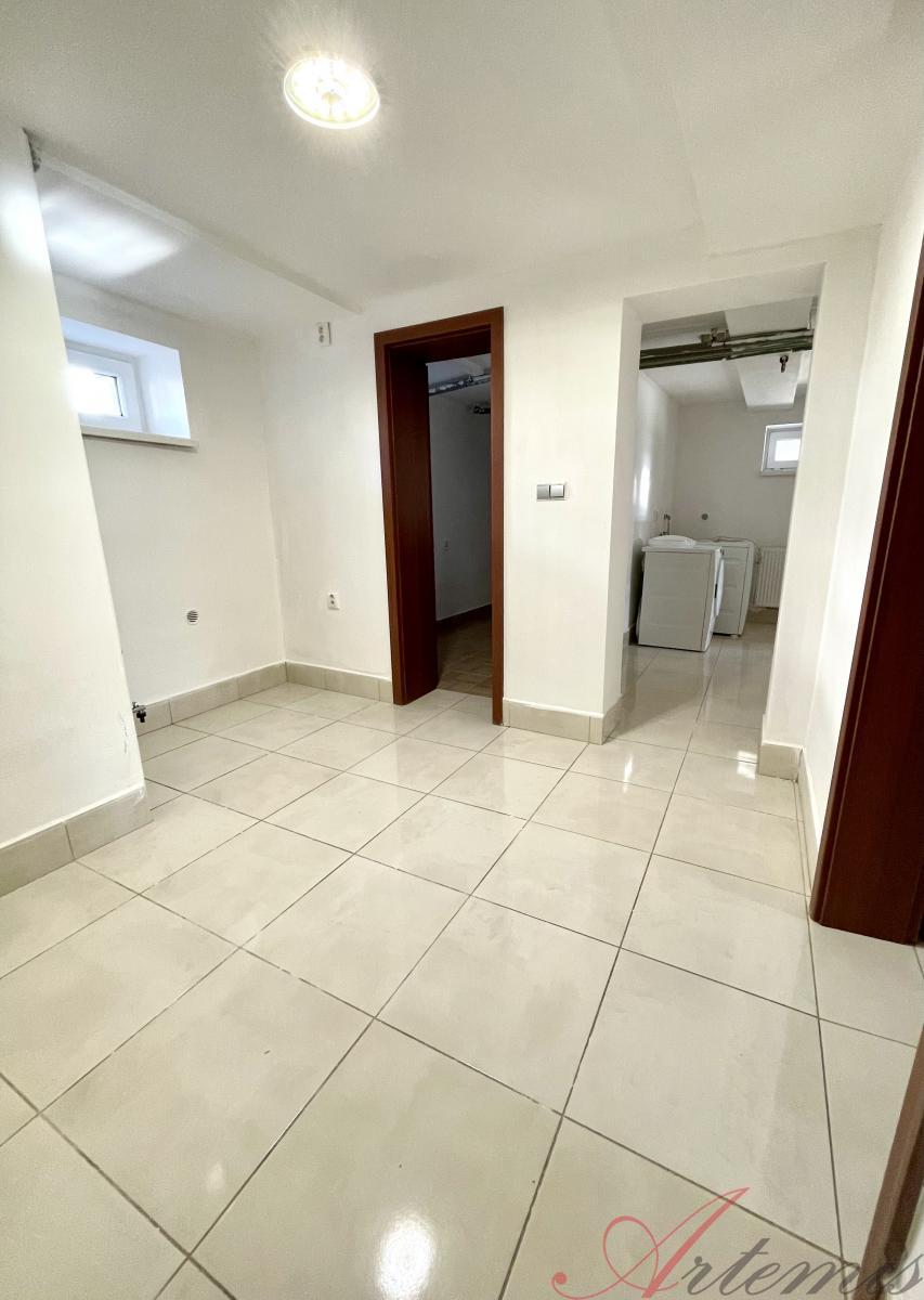 V podzemním podlaží se nachází technická místnost, prádelna a prostorná místnost, která má předpoklad k vybudování domácího wellness. Schodištěm vstupujeme do centrální části domu, prvního nadzemního podlaží, které je tvořeno otevřeným obývacím prostorem s krbem a přilehlou kuchyní s veškerými spotřebiči (lednice s mrazákem, myčka, mikrovlnná trouba, indukční varná deska, digestoř a elektrická trouba). Na patře se dále nachází samostatný pokoj, koupelna se sprchovým koutem a toaleta.