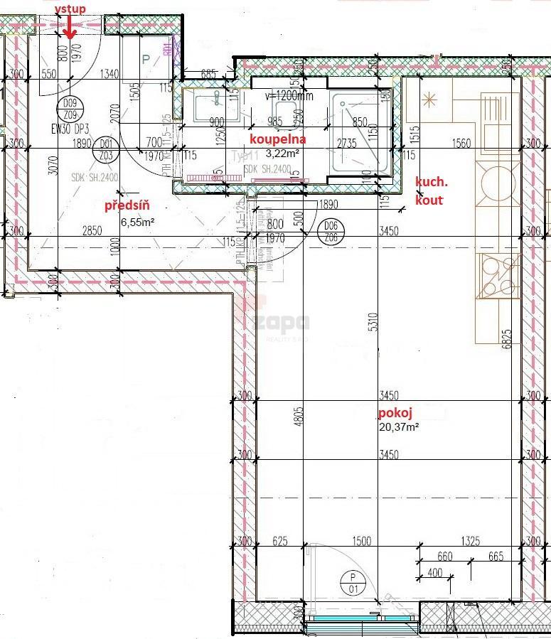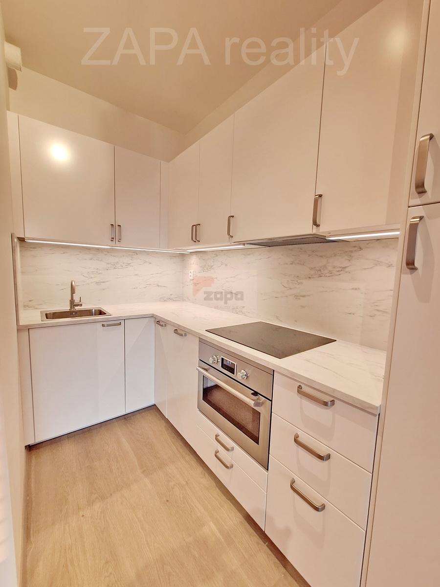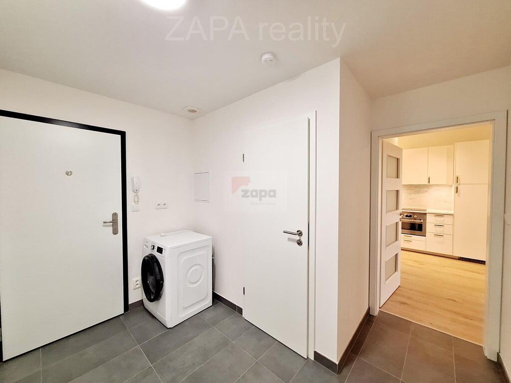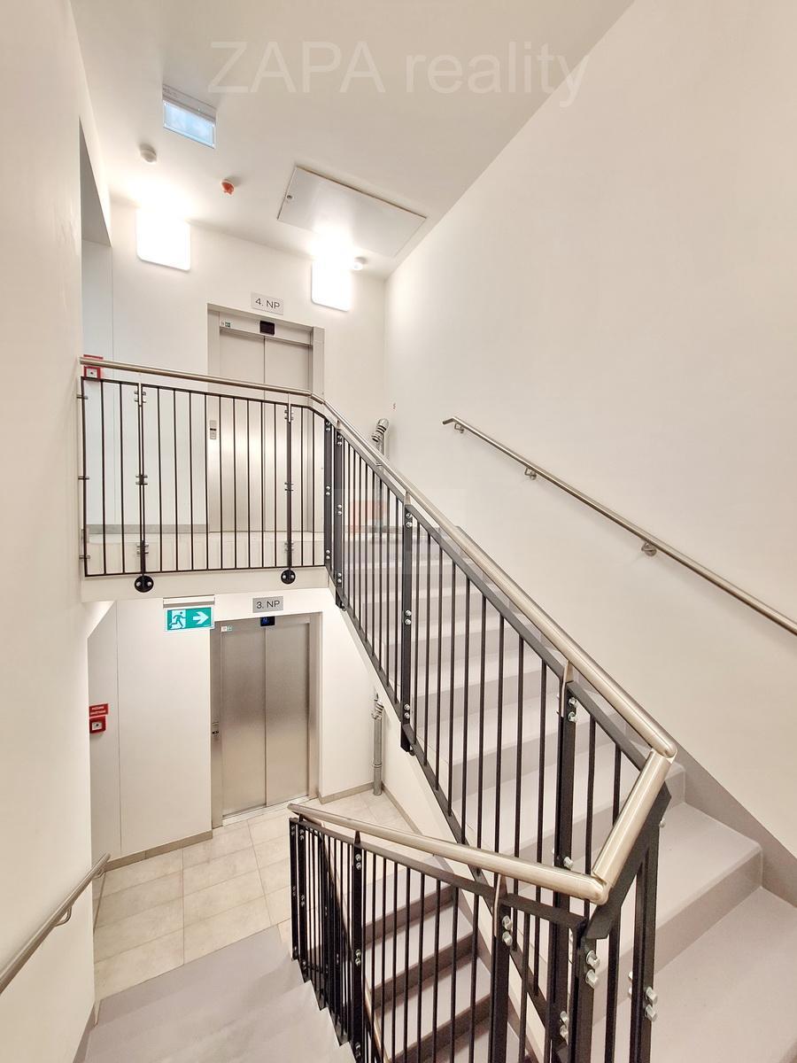 Byt se nachází ve 4. patře s výtahem, je vybaven novou kuch. linkou s vestavěnými spotřebiči (el. a mikrovlnná trouba, sklokeramická varná deska, myčka, lednice s mrazákem) a pračkou, jinak je byt nezařízený. V koupelně je sprchový kout a WC, na podlahách je plovoucí podlaha nebo dalžba, okna mají el. předokenní žaluzie, v bytě kabel pro internet. K bytu náleží zděný sklep v přízemí domu.