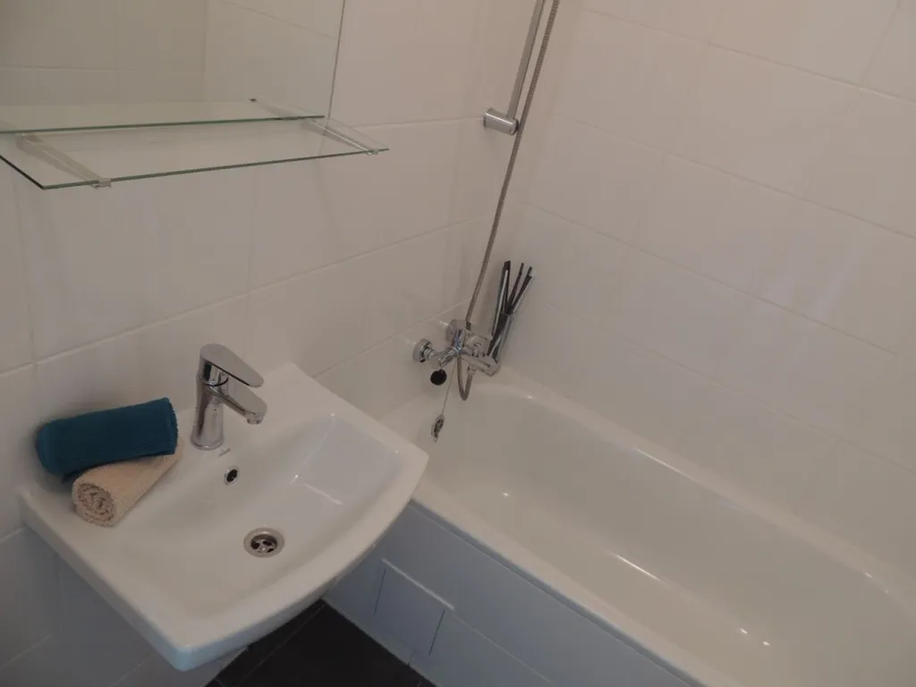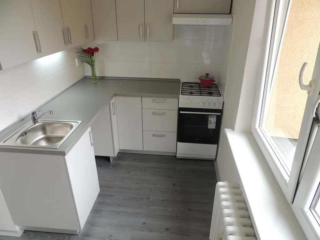 Koupelna s vanou a umyvadlem, toaleta je odděleně. Byt disponuje kuchyňskou linkou s kombinovaným sporákem.