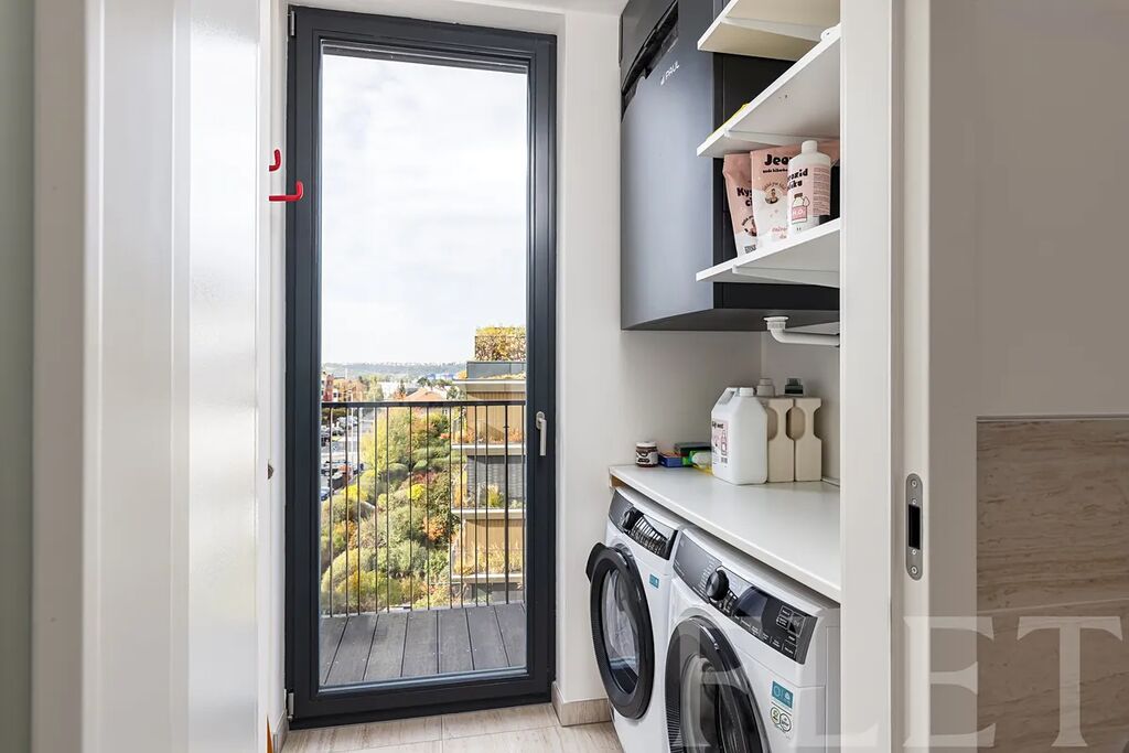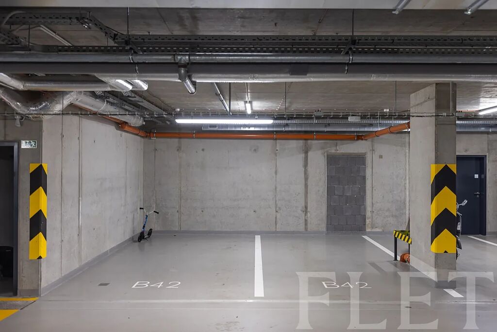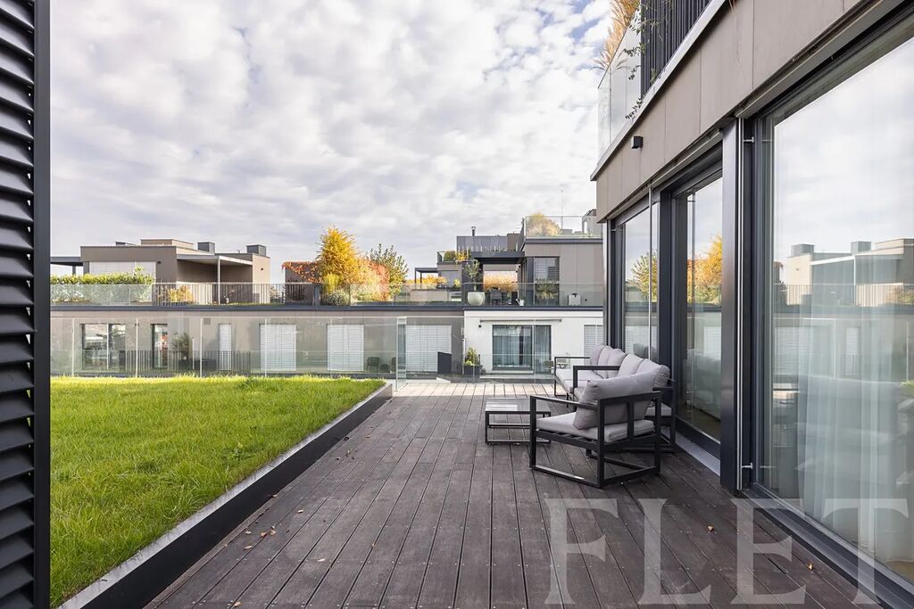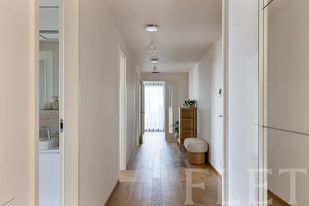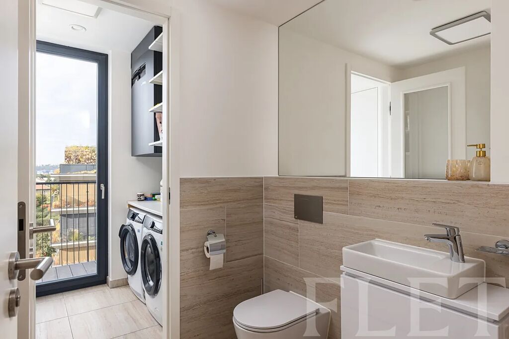 Dominantou bytu je velkorysý obývací prostor s nadčasovou kuchyňskou linkou vybavenou spotřebiči nejvyšší třídy. Odtud je přímý vstup na rozlehlou terasu s panoramatickým výhledem na celou Prahu, která se stane vaším nejoblíbenějším místem k odpočinku i večerním posezením. Hlavní ložnice disponuje soukromým balkónem, zatímco koupelna vyniká luxusními materiály, dvěma umyvadly, vanou i sprchovým koutem. K dispozici je také samostatná toaleta a technická místnost s pračkou a sušičkou. Dřevěné podlahy, velkoformátová okna, klimatizace a špičkové úložné prostory dotvářejí atmosféru moderního městského luxusu. Součástí nájmu jsou dvě garážová stání a dva sklepy.
