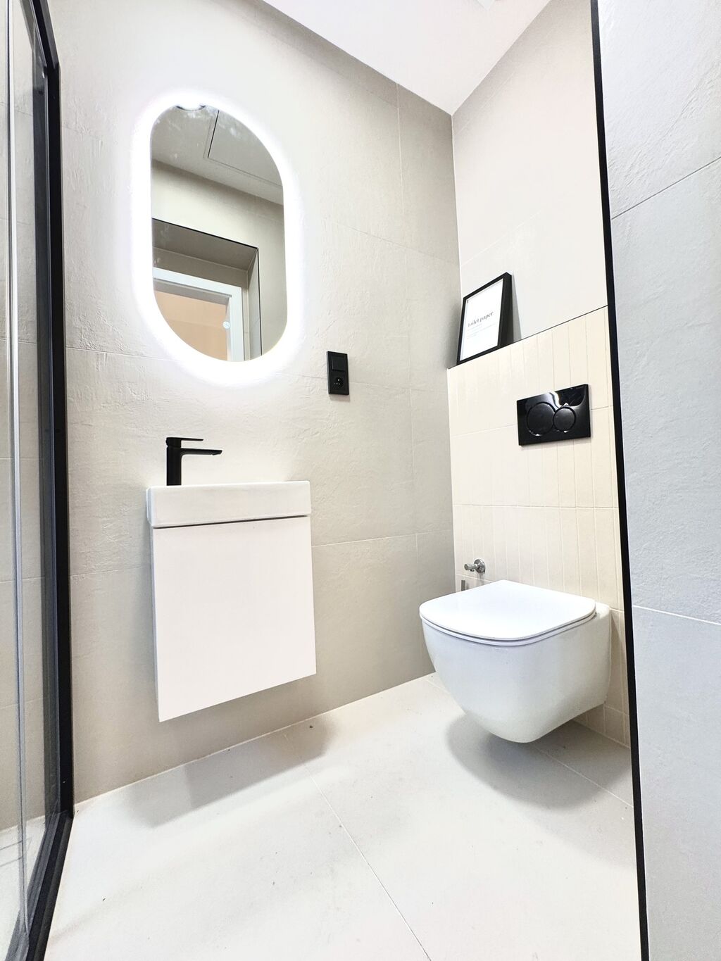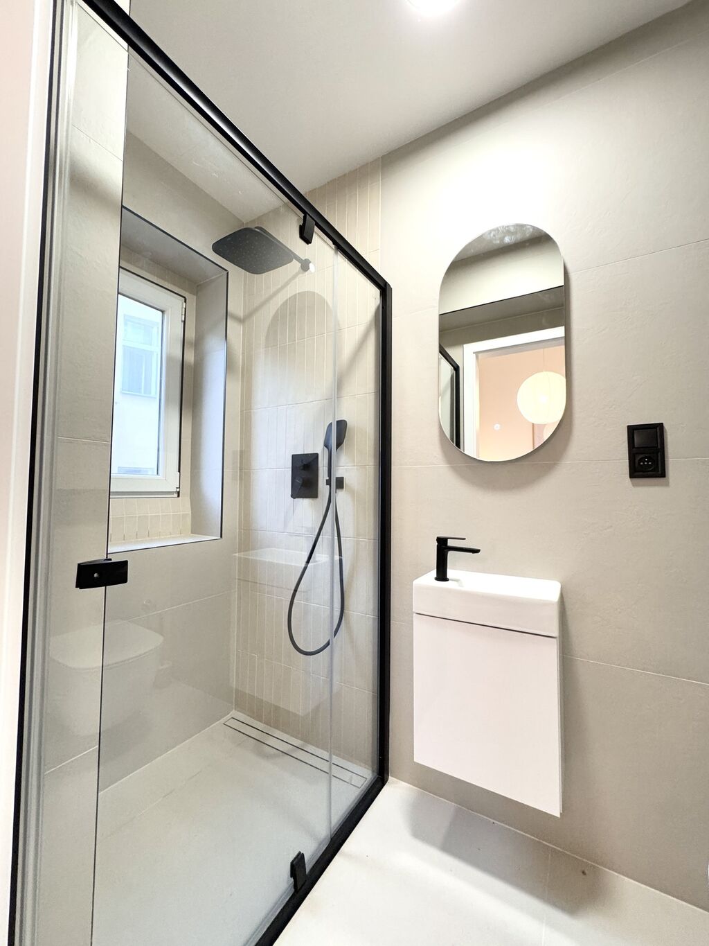 V bytě byly nově zhotoveny podlahy, provedeny obklady a dlažby a zároveň došlo k výměně elektroinstalace, vodovodních a odpadních rozvodů. Součástí vybavení je moderní kuchyňská sestava s barovým sezením včetně spotřebičů, na které se stále vztahuje záruční lhůta. Komfort zajišťují dvě koupelny – jedna se sprchovým koutem a toaletou, druhá s vanou a samostatnou toaletou. V celém bytě je podlahové vytápění, ohřev vody zajišťuje elektrický bojler.