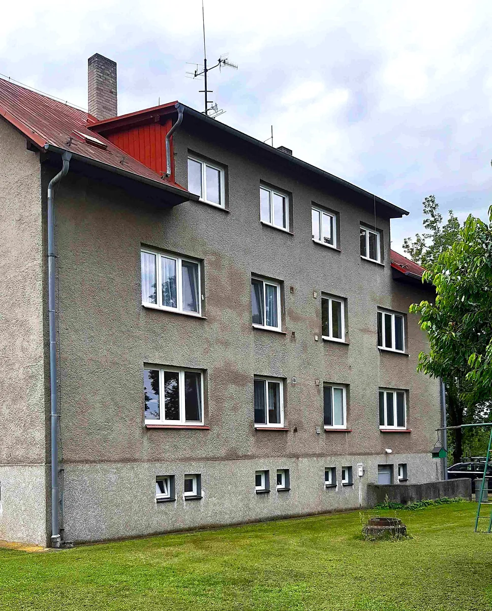 Obvodové nosné konstrukce domu jsou zděné z cihelného zdiva, bez zateplení. Stropní konstrukce nad suterénem, přízemím a patrem jsou ze železobetonových panelů, strop nad podkrovím je dřevěný. Zastřešení je provedeno sedlovým vázaným krovem s ryzalitem. Střešní krytina je plechová, ze šablon, provedená cca před 15 - 20 lety. Klempířské prvky byly vyměněny, jsou z titanzinku. Venkovní omítky jsou břízolitové, škrabané, soklové zdivo je upraveno tvrdou cementovou omítkou s kamínky. Vnitřní omítky jsou vápenné, štukové, doplněné v sociálních zařízeních a kuchyních běžnými keramickými obklady. Podlahové konstrukce v suterénu jsou z betonové mazaniny upravené nátěrem, v přízemí je na chodbě keramická dlažba, v bytech pak PVC v kombinaci s keramickými dlažbami. Okna jsou osazena plastová, výměna za dřevěná proběhla cca před 13 lety. Dveře v bytech a suterénu jsou zabudovány do ocelových zárubní, dveře jsou hladké a prosklené. Vstupní dveře do objektu byly vyměněny společně s okny, portál je plastový. Elektroinstalace zavedena 230/400V v běžném rozsahu, hromosvod na domě je instalovaný. Rozvody vody teplé a studené provedeny v běžném rozsahu. Ohřev teplé užitkové vody zajištěn v jednotlivých bytech elektrickými boilery. Kanalizace provedena v běžném rozsahu se svedením do ČOV. Vybavení jednotlivých bytů zařizovacími předměty je ve standardním provedení - umývadla, vany, sprchový kout, běžné WC combi. Kuchyně jsou vybaveny elektrickými sporáky, kuchyňskými linkami, digestoře jsou osazeny. Na objektu je osazena STA s rozvodem do jednotlivých bytů. V suterénu domu se nacházejí sklepní koje pro jednotlivé byty a společné prostory - prádelna sušárna, kotelna, sklad paliva. V sušárně se nachází starý mandl, který je dlouhodobě mimo provoz. Celkový stav objektu je dobrý, bez viditelných závad, v běžném opotřebení.