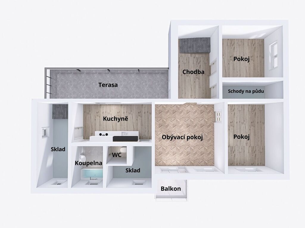 Horní byt disponuje prostornou terasou o velikosti 20 m², ideální pro odpočinek či posezení na čerstvém vzduchu. Spodní byt prošel v roce 2017 rekonstrukcí, při které byly zmodernizovány zejména rozvody elektřiny a vody.