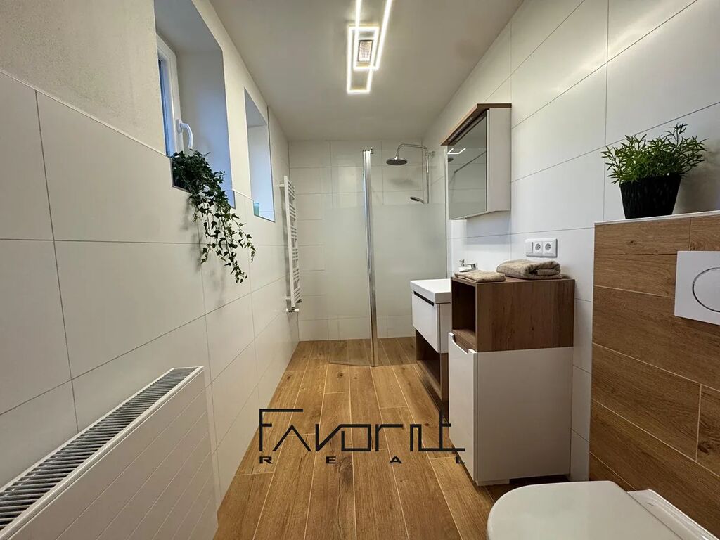 • Moderní koupelna se sprchovým koutem, umyvadlem se skříňkou, zrcadlem a wc.