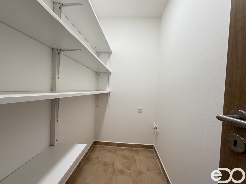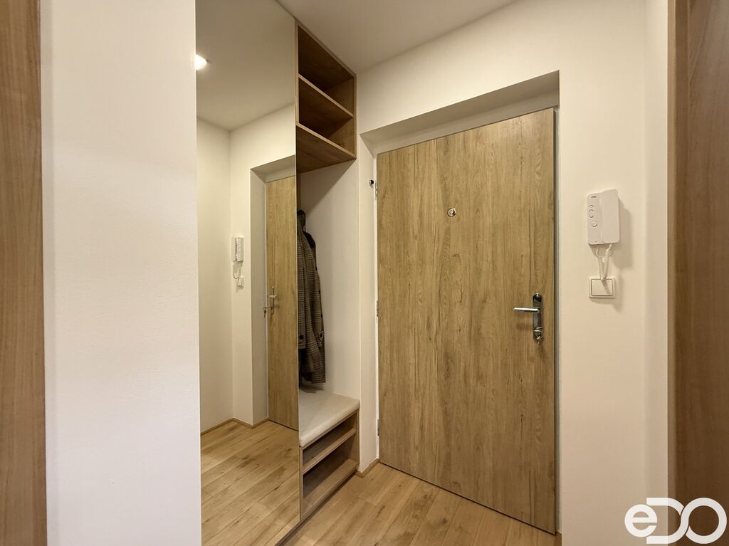 Byt má praktické dispoziční řešení – obývací pokoj s plně vybavením kuchyňským koutem a vstupem na balkon, samostatnou ložnici s vestavěnou skříní, koupelnu se sprchou, šatnu, předsíň a samostatné WC. K bytu patří také komora na patře a venkovní parkovací stání. Komfort zajišťují dubové podlahy, klimatizace, elektricky ovládané venkovní rolety a je zde k dispozici optický internet (SP Com). V bytě jsou moderní prvky, které zaručují příjemné bydlení po celý rok.