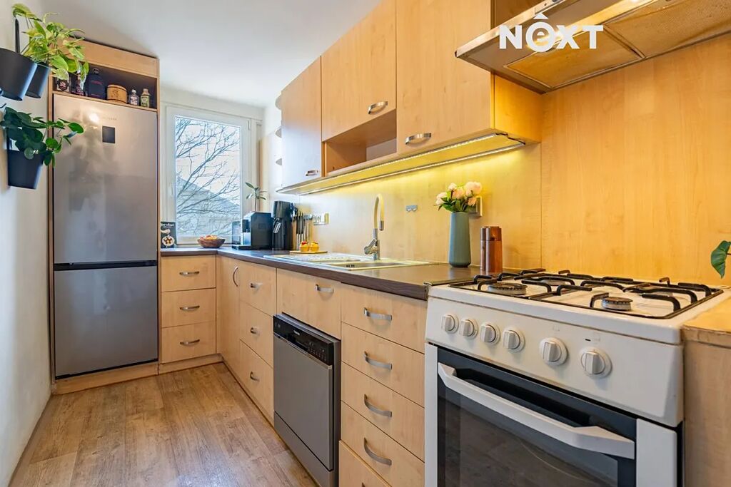 Na koupelnu navazuje praktická kuchyň s velkou pracovní deskou a oknem. Je vybavena plynovým sporákem, elektrickou troubou a myčkou nádobí (lednice není součástí prodeje).